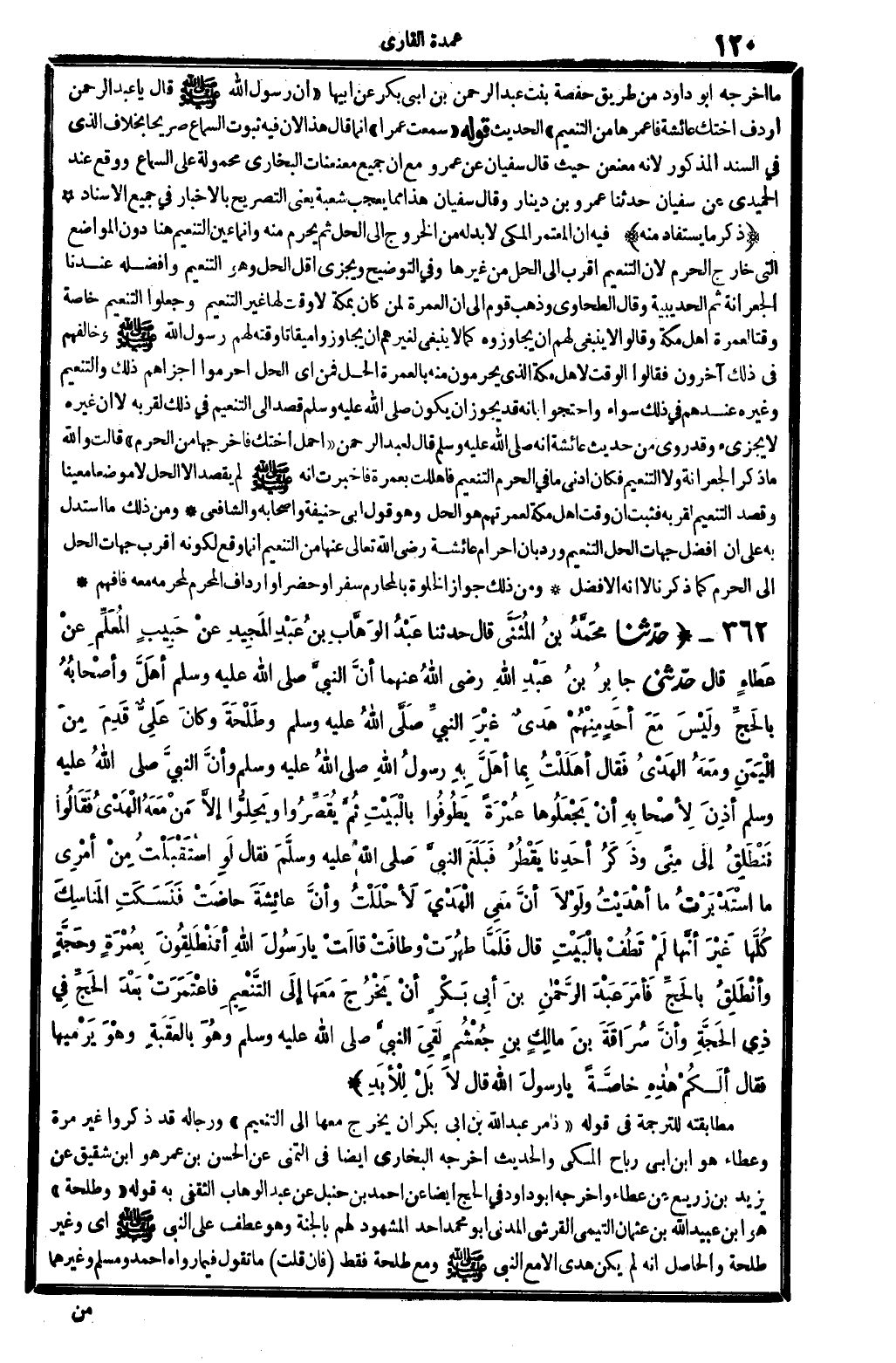 5871 - حدَّثنا محَمَّدُ بنُ المُثَنَّى قَالَ حدَّثنا عَبدُ الوَهَّابِ بنُ عَبْدِ المَجِيدِ عنْ حَبيبٍ المُعَلِّمِ عنْ عَطاءٍ قَالَ حدَّثني جابِرُ بنُ عَبْدِ الله رَضِي الله تَعَالَى عَنْهُمَا أنَّ النبيَّ صلى الله عَلَيْهِ وَسلم أهَلَّ وأصْحَابُهُ بالحَجِّ ولَيْسَ مَعَ أحَدٍ مِنْهُمْ هَديٌ غيْرَ النبيِّ صلى الله عَلَيْهِ وَسلم وطَلْحَةَ وكانَ عَلِيٌّ قَدِمَ مِنَ اليَمَنِ ومَعَهُ الهَدْيُ فَقالَ أهْلَلْتُ بِما أَهَلَّ بِهِ رسولُ الله صلى الله عَلَيْهِ وَسلم وأنَّ النبيَّ صلى الله عَلَيْهِ وَسلم أذِنَ لأِصْحَابِهِ أنْ يَجْعَلُوهَا عُمْرَةً يَطُوفُوا بِالْبَيْتِ ثُمَّ يُقَصِّرُوا ويَحِلُّوا إلاَّ مَنْ مَعَهُ الْهَدْيِ فقَالُوا نَنْطَلِقُ إِلَى مِنىً وذَكَرُ أحَدِنا يَقْطُرُ فبَلَغَ النبيَّ صلى الله عَلَيْهِ وَسلم فقالَ لَوِ اسْتَقْبَلْتُ مِنْ أمْرِي مَا اسْتَدْبَرْتُ مَا أهْدَيْتُ ولَوْلاَ أنَّ مَعِي الْهَدْيَ لأَحْلَلْتُ وأنَّ عائِشَةَ حاضَتْ فَنَسَكَتْ المَنَاسِكَ كُلَّهَا غَيْرَ أنَّهَا لَمْ تَطُفْ بِالبَيْتِ قَالَ فَلَمَّا طهُرَتْ وطافَتْ قالَتْ يَا رَسُولَ الله أتَنْطَلِقُونَ بِعُمْرَةٍ وحَجَّةٍ وأنْطَلِقُ بِالحَجِّ فأمَرَ عَبْدَ الرَّحْمانِ بنَ أبِي بَكْرٍ أنْ يَخْرُجَ مَعَهَا إلَى التَّنْعِيمِ فاعْتَمَرَتْ بَعْدَ الحَجِّ فِي ذِي الحَجَّةِ وأنَّ سُرَاقَةَ بنَ مَالِكٍ بنِ جُعْشُمٍ لَقِيَ النبيَّ صلى الله عَلَيْهِ وَسلم وهْوَ بالعَقَبةِ وهْوَ يَرْمِيهَا فَقَالَ ألَكُمْ هاذِهِ خَاصَّةً يَا رسولَ الله قَالَ لاَ بَلْ لِلأبَدِ..