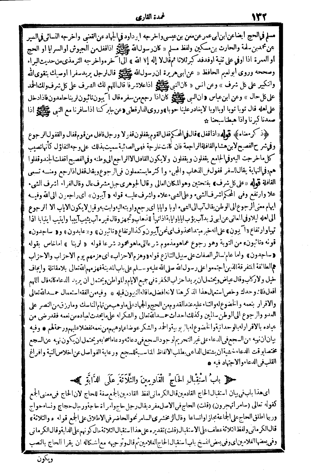 ذكر مَعْنَاهُ: قَوْله: (إِذا قفل) ، قَالَ فِي (الْمُحكم) قفل الْقَوْم: يقفلون قفولاً، وَرجل قافل من قوم قفال، والقفول: الرُّجُوع. وَفِي (شرح الفصيح) لِابْنِ هِشَام: الْقَافِلَة الراجعة، فَإِن كَانَت خَارِجَة فَهِيَ الصائبة، سميت بذلك على وَجه التفاؤل كَأَنَّهَا تصيب كل مَا خرجت إِلَيْهِ. وَفِي (الْجَامِع) : يقفلون ويقفلون وَلَا يكون القافل إلاَّ الرَّاجِع إِلَى وَطنه. وَفِي (الفصيح) : أقفلت الْجند وقفلوا هم. وَفِي (النِّهَايَة) : يُقَال للسَّفر قفول فِي الذّهاب والمجيء. وَأكْثر مَا يستعملون فِي الرُّجُوع، وَيُقَال: قفل إِذا رَجَعَ، وَمِنْه تسمى الْقَافِلَة. قَوْله: (على كل شرف) ، بِفتْحَتَيْنِ وَهُوَ الْمَكَان العالي. وَقَالَ الْجَوْهَرِي: جبل مشرف عَال. وَقَالَ الْفراء: أشرف الشَّيْء علا وارتفع. وَفِي (الْمُحكم) أشرف الشَّيْء وَعلا الشَّيْء: علاهُ، وأشرف عَلَيْهِ. قَوْله: (آيبون) ، أَي: رَاجِعُون إِلَى الله، وَفِيه إِيهَام معنى الرُّجُوع إِلَى الوطن، يُقَال: آب إِلَى الشَّيْء أوبا وإيابا أَي: رَجَعَ، وأوبته إِلَيْهِ وأبت بِهِ. وَقيل: لَا يكون الإياب إلاَّ الرُّجُوع إِلَى أَهله لَيْلًا وَفِي (الْمعَانِي) عَن أبي زيد: آب يؤب إيابا وإيابة إِذا تهَيَّأ للذهاب وتجهز. وَقَالَ غَيره: آب يئيب آييبا وإيتيب إيتابا إِذا تهَيَّأ. وارتفاع (آيبون) على أَنه خبر مُبْتَدأ مَحْذُوف أَي: نَحن آيبون، وَكَذَا ارْتِفَاع (تائبون) و (عَابِدُونَ) و (ساجدون) . قَوْله: (تائبون) من التَّوْبَة، وَهُوَ رُجُوع عَمَّا هُوَ مَذْمُوم شرعا إِلَى مَا هُوَ مَحْمُود شرعا. قَوْله: (لربنا) إِمَّا خَاص بقوله: (ساجدون) ، وَإِمَّا عَام لسَائِر الصِّفَات على سَبِيل التَّنَازُع. قَوْله: (وَهزمَ الْأَحْزَاب) أَي: هَزَمَهُمْ يَوْم الْأَحْزَاب. والأحزاب هم الطَّائِفَة المتفرقة الَّذين اجْتَمعُوا على رَسُول الله، صلى الله عَلَيْهِ وَسلم، على بَاب الْمَدِينَة، فَهَزَمَهُمْ الله تَعَالَى بِلَا مقاتلة وإيجاف خيل وَلَا ركاب. وَقَالَ عِيَاض: وَيحْتَمل أَن يُرِيد أحزاب الْكَفَرَة فِي جَمِيع الْأَيَّام والمواطن، وَيحْتَمل أَن يُرِيد الدُّعَاء كَأَنَّهُ قَالَ: أللهم افْعَل ذَلِك وَحدك، وَخص اسْتِعْمَال هَذَا الذّكر هُنَا لِأَنَّهُ أفضل مَا قَالَه النَّبِيُّونَ قبله.