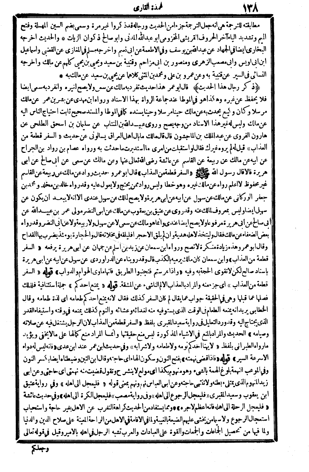 ذكر رجال هَذَا الحَدِيث قَالَ أَبُو عمر: هَذَا حَدِيث تفرد بِهِ مَالك عَن سمي، وَلَا يَصح لغيره، وَانْفَرَدَ بِهِ سمي أَيْضا فَلَا يحفظ عَن غَيره، وَهَكَذَا هُوَ فِي (الْمُوَطَّأ) عِنْد جمَاعَة الروَاة بِهَذَا الْإِسْنَاد، وَرَوَاهُ ابْن مهْدي عَن بشر بن عمر عَن مَالك مُرْسلا، وَكَانَ وَكِيع يحدث بِهِ عَن مَالك حينا مُرْسلا، وحينا يسْندهُ كَمَا فِي (الْمُوَطَّأ) والمسند صَحِيح ثَابت احْتِيَاج النَّاس إِلَيْهِ عَن مَالك، وَلَيْسَ لَهُ غير هَذَا الْإِسْنَاد من وَجه يَصح، وروى عبيد الله بن المنتاب عَن سُلَيْمَان بن إِسْحَاق الطلحي عَن هَارُون الْفَروِي عَن عبد الْملك بن الْمَاجشون، قَالَ: قَالَ مَالك: مَا بَال أهل الْعرَاق يَسْأَلُونِي عَن حَدِيث: (السّفر قِطْعَة من الْعَذَاب) ، قيل لَهُ: لم يروه غَيْرك، فَقَالَ: لَو اسْتقْبلت من أَمْرِي مَا اسْتَدْبَرت مَا حدثت بِهِ، وَرَوَاهُ عِصَام بن رواد بن الْجراح عَن أَبِيه عَن مَالك عَن ربيعَة عَن الْقَاسِم عَن عَائِشَة، رَضِي الله تَعَالَى عَنْهَا، وَعَن مَالك عَن سمي عَن أبي صَالح عَن أبي هُرَيْرَة، قَالَا: قَالَ رَسُول الله صلى الله عَلَيْهِ وَسلم: (السّفر قِطْعَة من الْعَذَاب) قَالَ أَبُو عَمْرو: حَدِيث رواد عَن مَالك عَن ربيعَة عَن الْقَاسِم غير مَحْفُوظ، لَا أعلم رَوَاهُ عَن مَالك غَيره، وَهُوَ (خطأ) وَلَيْسَ رواد مِمَّن يحْتَج وَلَا يعول عَلَيْهِ، وَقد رَوَاهُ خَالِد بن مخلد وَمُحَمّد بن جَعْفَر الْوَركَانِي عَن مَالك عَن سُهَيْل عَن أَبِيه عَن أبي هُرَيْرَة، وَلَا يَصح لمَالِك عَن سُهَيْل عِنْدِي إلاَّ أَنه لَا يبعد أَن يكون عَن سُهَيْل أَيْضا، وَلَيْسَ بِمَعْرُوف لمَالِك عَنهُ، وَقد روى عَن عَتيق بن يَعْقُوب عَن مَالك عَن أبي النَّضر مولى عمر بن عبيد الله عَن أبي صَالح عَن أبي هُرَيْرَة مَرْفُوعا، وَلَا يَصح أَيْضا عِنْدِي، وَإِنَّمَا هُوَ مَالك عَن سمي لَا عَن سُهَيْل وَلَا ربيعَة، وَلَا عَن أبي النَّضر. وَقد رَوَاهُ بعض الضُّعَفَاء عَن مَالك، فَقَالَ: وليتخذ لأَهله هَدِيَّة وَإِن لم يلق إلاَّ حجرا فليلقه فِي مخلاته. قَالَ: وَالْحِجَارَة يَوْمئِذٍ يضْرب بهَا القداح. وَقَالَ أَبُو عَمْرو: هَذِه زِيَادَة مُنكرَة لَا تصح، وَرَوَاهُ ابْن سمْعَان عَن زيد بن أسلم عَن جمْهَان عَن أبي هُرَيْرَة، يرفعهُ: (السّفر قِطْعَة من الْعَذَاب) وَابْن سمْعَان كَانَ مَالك يرميه بِالْكَذِبِ، قَالَ: وَقد روينَاهُ عَن الدَّرَاورْدِي عَن سُهَيْل عَن أَبِيه عَن أبي هُرَيْرَة بِإِسْنَاد صَالح، لَكِن لَا تقوى الْحجَّة بِهِ، وَفِيه: (وَإِذا عرستم فتجنبوا الطَّرِيق فَإِنَّهَا مأوى الْهَوَام وَالدَّوَاب) .