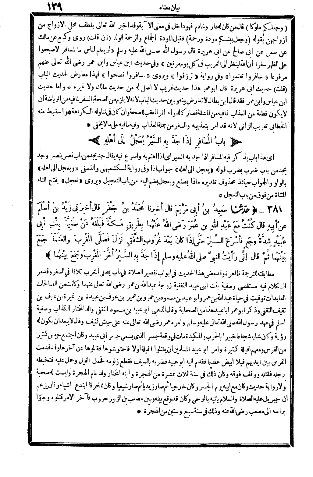 381 - (حَدثنَا سعيد بن أبي مَرْيَم قَالَ أخبرنَا مُحَمَّد بن جَعْفَر قَالَ أَخْبرنِي زيد بن أسلم عَن أَبِيه قَالَ كنت مَعَ عبد الله بن عمر رَضِي الله عَنْهُمَا بطرِيق مَكَّة فَبَلغهُ عَن صَفِيَّة بنت أبي عبيد شدَّة وجع فأسرع السّير حَتَّى إِذا كَانَ بعد غرُوب الشَّفق نزل فصلى الْمغرب وَالْعَتَمَة جمع يبنهما ثمَّ قَالَ إِنِّي رَأَيْت النَّبِي - صَلَّى اللَّهُ عَلَيْهِ وَسَلَّم َ - إِذا جد بِهِ السّير أخر الْمغرب وَجمع بَينهمَا) مطابقته للتَّرْجَمَة ظَاهِرَة وَقد مضى هَذَا الحَدِيث فِي أَبْوَاب تَقْصِير الصَّلَاة فِي بَاب يُصَلِّي الْمغرب ثَلَاثًا فِي السّفر وَقد مر الْكَلَام فِيهِ مستقصى وَصفِيَّة بنت أبي عبيد الثقفية زَوْجَة عبد الله بن عمر رَضِي الله تَعَالَى عَنْهُمَا وَكَانَت من الصَّالِحَات العابدات توفيت فِي حَيَاة عبد الله بن عَمْرو وَأَبُو عبيد بن مَسْعُود بن عَمْرو بن عُمَيْر بن عَوْف بن عُبَيْدَة بن غيرَة بن عَوْف بن ثَقِيف الثَّقَفِيّ وَذكر أَبُو عمر أَبَا عبيد هَذَا من الصَّحَابَة وَقَالَ الذَّهَبِيّ أَبُو عبيد بن مَسْعُود الثَّقَفِيّ وَالِد الْمُخْتَار الْكذَّاب وَصفِيَّة أسلم فِي عهد رَسُول الله - صَلَّى اللَّهُ عَلَيْهِ وَسَلَّم َ - وَأمره عمر رَضِي الله تَعَالَى عَنهُ على جَيش كثيف وَقَالَ لَا يبعد أَن يكون لَهُ رُؤْيَة وَكَانَ شَابًّا شجاعا خَبِيرا بِالْحَرْبِ والمكيدة مَاتَ فِي وقْعَة جسر الَّذِي يُسمى جسر أبي عبيد وَكَانَ اجْتمع جَيش كثير من الْفرس وَمَعَهُمْ أفيلة كَثِيرَة وَأمر أَبُو عبيد الْمُسلمين أَن يقتلُوا الفيلة أَولا فاحتوشوها فَقَتَلُوهَا عَن آخرهَا وَقد قدمت الْفرس بَين أَيْديهم فيلا أَبيض عَظِيما فَقدم إِلَيْهِ أَبُو عبيد فَضَربهُ بِالسَّيْفِ فَقطع زلومه فَحمل الْفِيل وَحمل عَلَيْهِ فتخبطه بِرجلِهِ فَقتله ووقف فَوْقه وَكَانَ ذَلِك فِي سنة ثَلَاث عشرَة من الْهِجْرَة وَابْنه الْمُخْتَار ولد عَام الْهِجْرَة وَلَيْسَت لَهُ صُحْبَة وَلَا رِوَايَة حَدِيث وَكَانَ مَعَ أَبِيه يَوْم الجسر وَكَانَ خارجيا ثمَّ صَار زيد يَأْثَم صَار شِيعِيًّا وَكَانَ ممخرقا ابتدع أَشْيَاء كَانَ يزْعم أَن جِبْرِيل عَلَيْهِ الصَّلَاة وَالسَّلَام يَأْتِيهِ بِالْوَحْي وَكَانَ قد وَقع بَينه وَبَين مُصعب بن الزبير حروب فآخر الْأَمر قَتَلُوهُ وجاؤا بِرَأْسِهِ إِلَى مُصعب رَضِي الله عَنهُ وَذَلِكَ فِي سنة سبع وَسِتِّينَ من الْهِجْرَة -