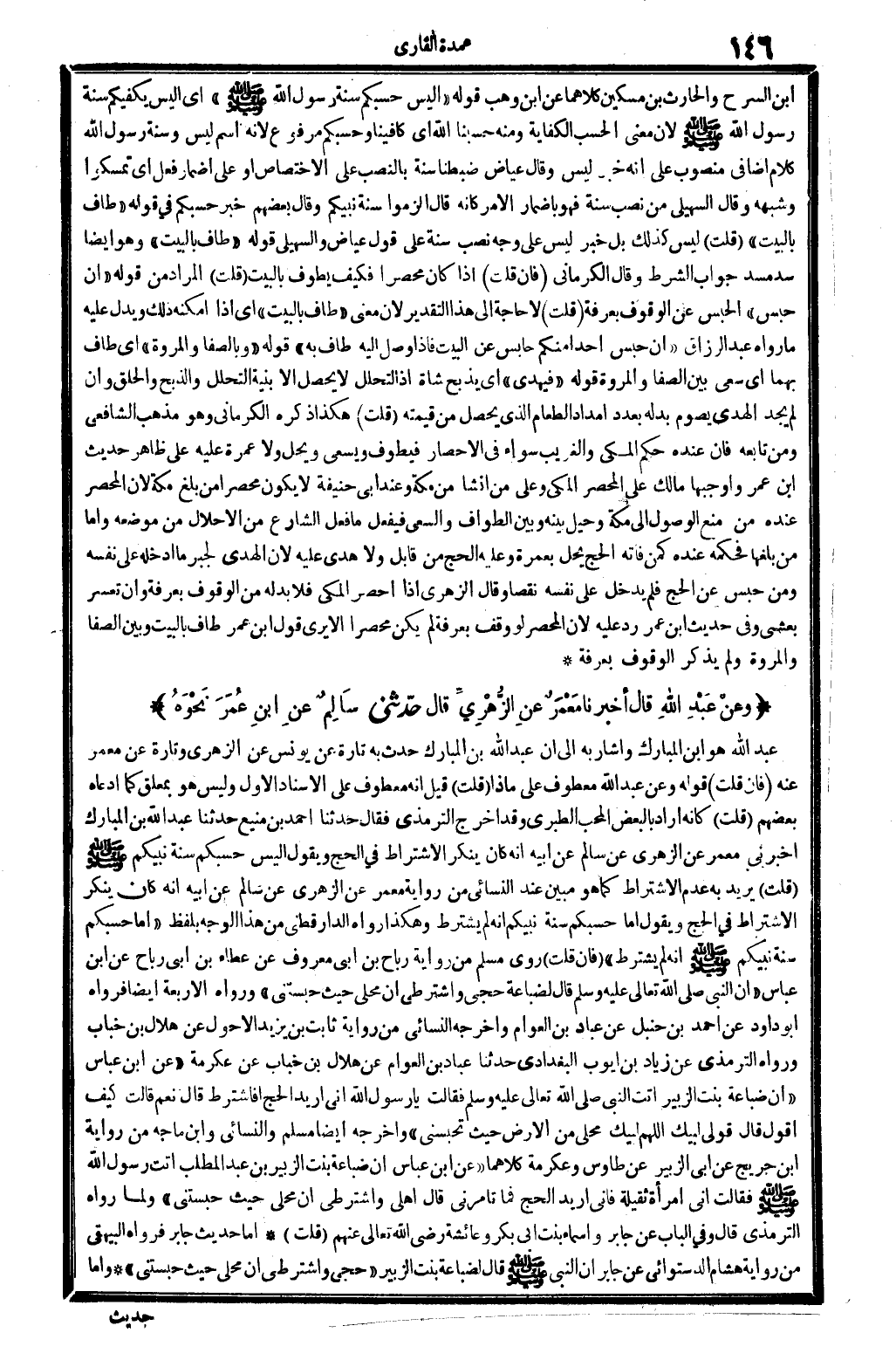 عبد الله هُوَ ابْن الْمُبَارك، وَأَشَارَ بِهِ إِلَى أَن عبد الله بن الْمُبَارك حدث بِهِ تَارَة عَن يُونُس عَن الزُّهْرِيّ، وَتارَة عَن معمر عَنهُ. فَإِن قلت: قَوْله: وَعَن عبد الله، مَعْطُوف على: مَاذَا؟ قلت: قيل: إِنَّه مَعْطُوف على الْإِسْنَاد الأول، وَلَيْسَ هُوَ بمعلق كَمَا ادَّعَاهُ بَعضهم. قلت: كَأَنَّهُ أَرَادَ بِالْبَعْضِ الْمُحب الطَّبَرِيّ، وَقد أخرج التِّرْمِذِيّ، فَقَالَ: حَدثنَا أَحْمد بن منيع حَدثنَا عبد الله بن الْمُبَارك أَخْبرنِي معمر عَن الزُّهْرِيّ عَن سَالم عَن أَبِيه أَنه كَانَ يُنكر الِاشْتِرَاط فِي الْحَج، وَيَقُول: أَلَيْسَ حسبكم سنة نَبِيكُم صلى الله عَلَيْهِ وَسلم؟ قلت: يُرِيد بِهِ عدم الِاشْتِرَاط كَمَا هُوَ مُبين عِنْد النَّسَائِيّ من رِوَايَة معمر عَن الزُّهْرِيّ عَن سَالم عَن أَبِيه أَنه كَانَ يُنكر الِاشْتِرَاط فِي الْحَج، وَيَقُول: أما حسبكم سنة نَبِيكُم أَنه لم يشْتَرط؟ وَهَكَذَا رَوَاهُ الدَّارَقُطْنِيّ من هَذَا الْوَجْه بِلَفْظ: (أما حسبكم سنة نَبِيكُم صلى الله عَلَيْهِ وَسلم أَنه لم يشْتَرط؟) فَإِن قلت: روى مُسلم من رِوَايَة رَبَاح بن أبي مَعْرُوف عَن عَطاء بن أبي رَبَاح عَن ابْن عَبَّاس (أَن النَّبِي، صلى الله عَلَيْهِ وَسلم، قَالَ لضباعة: حجي واشترطي أَن محلي حَيْثُ حبستني) . وَرَوَاهُ الْأَرْبَعَة أَيْضا، فَرَوَاهُ أَبُو دَاوُد عَن أَحْمد بن حَنْبَل عَن عباد بن الْعَوام، وَأخرجه النَّسَائِيّ من رِوَايَة ثَبت بن يزِيد الْأَحول عَن هِلَال بن خباب، وَرَوَاهُ التِّرْمِذِيّ عَن زِيَاد بن أَيُّوب الْبَغْدَادِيّ: حَدثنَا عباد بن الْعَوام عَن هِلَال بن خباب عَن عِكْرِمَة عَن ابْن عَبَّاس: (أَن ضباعة بنت الزبير أَتَت النَّبِي، صلى الله عَلَيْهِ وَسلم، فَقَالَت: يَا رَسُول الله! إِنِّي أُرِيد الْحَج أفأشترط؟ قَالَ: نعم. قَالَت: كَيفَ أَقُول؟ قَالَ: قولي لبيْك اللَّهُمَّ لبيْك محلي من الأَرْض حَيْثُ تحبسني) . وَأخرجه أَيْضا مُسلم وَالنَّسَائِيّ وَابْن مَاجَه من رِوَايَة ابْن جريج عَن أبي الزبير عَن طَاوُوس وَعِكْرِمَة كِلَاهُمَا (عَن ابْن عَبَّاس: أَن ضباعة بنت الزبير بن عبد الْمطلب أَتَت رَسُول الله صلى الله عَلَيْهِ وَسلم فَقَالَت إِنِّي امْرَأَة ثَقيلَة، فَإِنِّي أُرِيد الْحَج فَمَا تَأْمُرنِي؟ قَالَ: أَهلِي واشترطي أَن محلي حَيْثُ حبستني) ، وَلما رَوَاهُ التِّرْمِذِيّ قَالَ: وَفِي الْبَاب عَن جَابر وَأَسْمَاء بنت أبي بكر وَعَائِشَة، رَضِي الله تَعَالَى عَنْهُم. قلت: أما حَدِيث جَابر فَرَوَاهُ الْبَيْهَقِيّ من رِوَايَة هِشَام الدستوَائي عَن جَابر أَن النَّبِي صلى الله عَلَيْهِ وَسلم قَالَ لضباعة بنت الزبير: (حجي واشترطي أَن محلي حَيْثُ حبستني) . وَأما