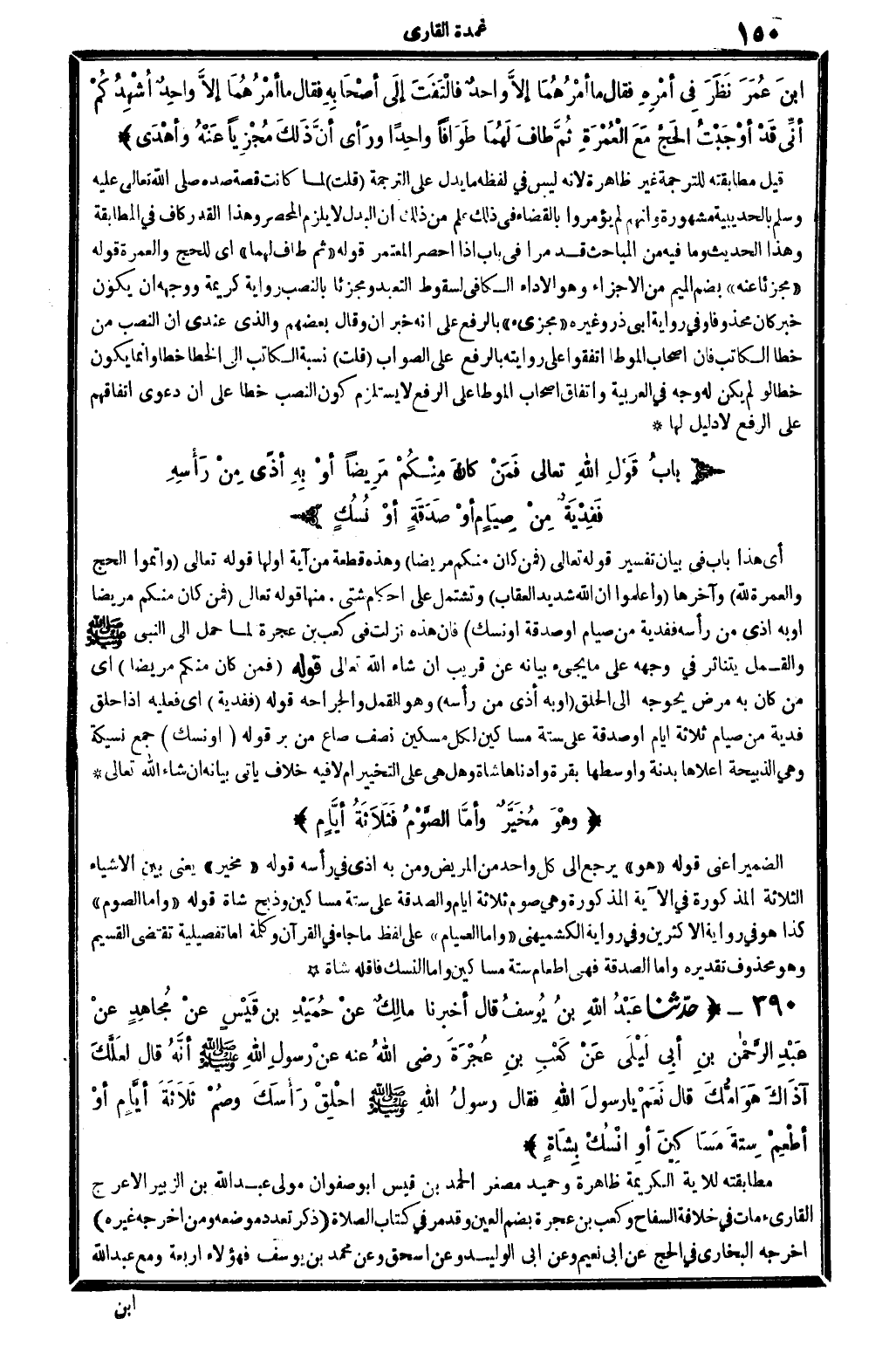 أَي: هَذَا بَاب فِي بَيَان تَفْسِير قَوْله تَعَالَى: {فَمن كَانَ مِنْكُم مَرِيضا} (الْبَقَرَة: 691) . وَهَذِه قِطْعَة من آيَة أَولهَا قَوْله تَعَالَى: {وَأَتمُّوا الْحَج وَالْعمْرَة صلى الله عَلَيْهِ وَسلم} (الْبَقَرَة: 691) . وَآخِرهَا: {وَاعْلَمُوا أَن الله شَدِيد الْعقَاب} (الْبَقَرَة: 691) . وتشتمل على أَحْكَام شَتَّى. مِنْهَا: قَوْله تَعَالَى: {فَمن كَانَ مِنْكُم مَرِيضا أَو بِهِ أَذَى من رَأسه ففدية من صِيَام أَو صَدَقَة أَو نسك} (الْبَقَرَة: 691) . فَإِن هَذِه نزلت فِي كَعْب بن عجْرَة لما حمل إِلَى النَّبِي صلى الله عَلَيْهِ وَسلم وَالْقمل يَتَنَاثَر فِي وَجهه، على مَا يَجِيء بَيَانه عَن قريب، إِن شَاءَ الله تَعَالَى.