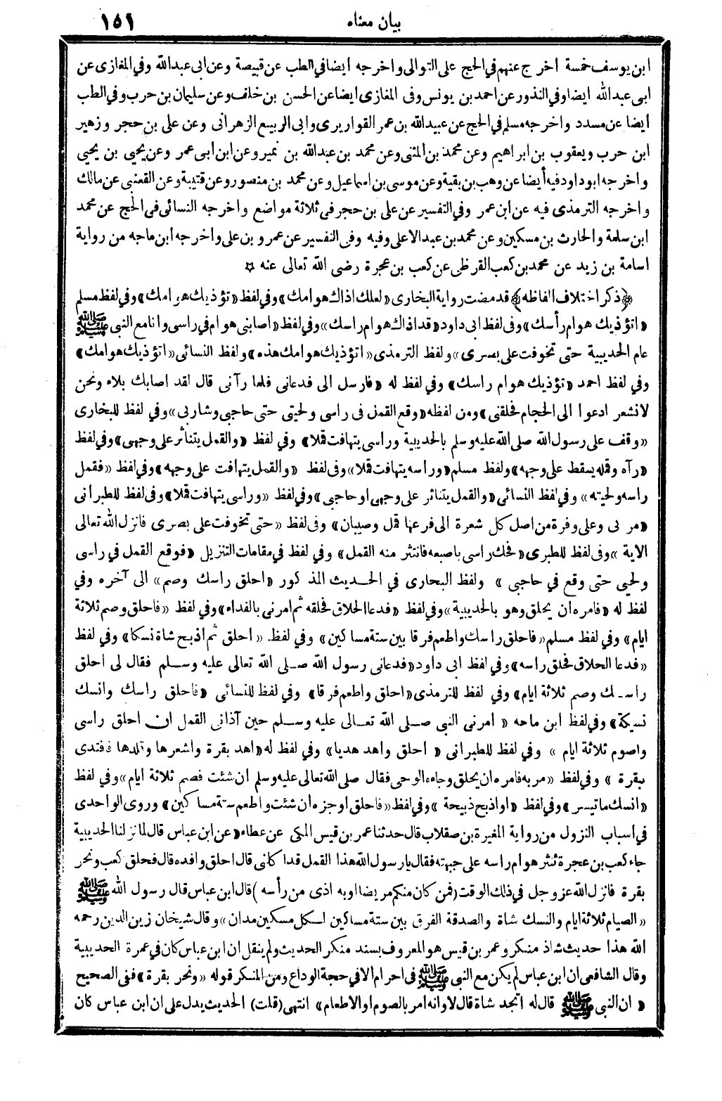 ذكر اخْتِلَاف أَلْفَاظه: قد مَضَت رِوَايَة البُخَارِيّ: (لَعَلَّك أذاك هوامك؟) وَفِي لفظ: (تؤذيك هوامك؟) وَفِي لفظ مُسلم: (أتؤذيك هوَام رَأسك؟) . وَفِي لفظ أبي دَاوُد: (قد أذاك هوَام رَأسك؟) . وَفِي لفظ: (أصابني هوَام فِي رَأْسِي وَأَنا مَعَ النَّبِي صلى الله عَلَيْهِ وَسلم عَام الْحُدَيْبِيَة حَتَّى تخوفت على بَصرِي) ، وَلَفظ التِّرْمِذِيّ: (أتؤذيك هوامك هَذِه؟) . وَلَفظ النَّسَائِيّ: (أتؤذيك هوامك؟) وَفِي لفظ أَحْمد: (تؤذيك هوَام رَأسك؟) وَفِي لفظ لَهُ: (فَأرْسل إِلَيّ فدعاني، فَلَمَّا رَآنِي قَالَ: لقد أَصَابَك بلَاء وَنحن لَا نشعر، أدعوا إِلَى الْحجام، فحلقني) . وَمن لَفظه: (وَقع الْقمل فِي رَأْسِي ولحيتي حَتَّى حاجبي وشاربي) ، وَفِي لفظ للْبُخَارِيّ (وقف عَليّ رَسُول الله، صلى الله عَلَيْهِ وَسلم، بِالْحُدَيْبِية ورأسي يتهافت قملاً) . وَفِي لفظ: (وَالْقمل يتهافت لماء جمعه وَفِي لفظ (فَقل رَأسه ولحيته) وَفِي لفظ يَتَنَاثَر على وَجْهي) ، وَفِي لفظ: (رَآهُ وقمله يسْقط على وَجهه) ، ولفط مُسلم رَأسه يتهافت قملاً وَفِي لفظ النَّسَائِيّ: (وَالْقمل يَتَنَاثَر على وَجْهي أَو حاجبي) ، وَفِي لفظ: (ورأسي يتهافت قملاً) . وَفِي لفظ للطبراني (مر بِي وَعلي وفرة من أصل كل شَعْرَة إِلَى فرعها قمل وصيبان) ، وَفِي لفظ: (حَتَّى تخوفت على بَصرِي، فَأنْزل الله تَعَالَى الْآيَة) . وَفِي لفظ للطبري: (فحك رَأْسِي بإصبعه فانتثر مِنْهُ الْقمل) ، وَفِي لفظ فِي (مقامات التَّنْزِيل) : (فَوَقع الْقمل فِي رَأْسِي ولحيي حَتَّى وَقع فِي حاجبي) ، وَلَفظ البُخَارِيّ فِي الحَدِيث الْمَذْكُور: (أحلق رَأسك وصم) إِلَى آخِره، وَفِي لفظ لَهُ: (فَأمره أَن يحلق وَهُوَ بِالْحُدَيْبِية) ، وَفِي لفظ: (فَدَعَا الحلاق فحلقه ثمَّ أَمرنِي بِالْفِدَاءِ) ، وَفِي لفظ: (فَاحْلِقْ وصم ثَلَاثَة أَيَّام) ، وَفِي لفظ مُسلم: (فَاحْلِقْ رَأسك وَأطْعم فرقا بَين سِتَّة مَسَاكِين) وَفِي لفظ: (إحلق ثمَّ اذْبَحْ شَاة نسكا) ، وَفِي لفظ: (فَدَعَا الحلاف فحلق رَأسه) ، وَفِي لفظ أبي دَاوُد: (فدعاني رَسُول الله، صلى الله عَلَيْهِ وَسلم، فَقَالَ لي: احْلق رَأسك وصم ثَلَاثَة أَيَّام) ، وَفِي لفظ لِلتِّرْمِذِي: (إحلق وَأطْعم فرقا) ، وَفِي لفظ للنسائي: (فَاحْلِقْ رَأسك وانسك نسيكة) ، وَفِي لفظ ابْن مَاجَه: (أَمرنِي النَّبِي، صلى الله عَلَيْهِ وَسلم، حِين آذَانِي الْقمل أَن أحلق رَأْسِي وَأَصُوم ثَلَاثَة أَيَّام) . وَفِي لفظ للطبراني: (إحلق واهد هَديا) ، وَفِي لفظ لَهُ: (اهد بقرة وأشعرها وقلدها فَافْتدى ببقرة) ، وَفِي لفظ: (مر بِهِ فَأمره أَن يحلق، وجاءه الْوَحْي فَقَالَ، صلى الله عَلَيْهِ وَسلم: إِن شِئْت فَصم ثَلَاثَة أَيَّام) . وَفِي لفظ: (أنسك مَا تيَسّر) . وَفِي لفظ: (أَو إذبح ذَبِيحَة) . وَفِي لفظ: (فَاحْلِقْ أَو جزه إِن شِئْت وَأطْعم سِتَّة مَسَاكِين) . وروى الواحدي فِي (أَسبَاب النُّزُول) من رِوَايَة الْمُغيرَة بن صقْلَابٍ، قَالَ: حَدثنَا عمر بن قيس الْمَكِّيّ عَن عَطاء (عَن ابْن عَبَّاس، قَالَ: لما نزلنَا الْحُدَيْبِيَة جَاءَ كَعْب بن عجْرَة، تنثر هوَام رَأسه على جَبهته، فَقَالَ: يَا رَسُول الله! هَذَا الْقمل قد أكلني، قَالَ: إحلق وافده. قَالَ: فحلق كَعْب وَنحر بقرة، فَأنْزل الله عز وَجل فِي ذَلِك الْوَقْت: {فَمن كَانَ مِنْكُم مَرِيضا أَو بِهِ أَذَى من رَأسه} (الْبَقَرَة: 691) . قَالَ ابْن عَبَّاس: قَالَ رَسُول الله صلى الله عَلَيْهِ وَسلم: (الصّيام ثَلَاثَة أَيَّام والنسك شَاة وَالصَّدَََقَة الْفرق بَين سِتَّة مَسَاكِين لكل مِسْكين مدَّان) . وَقَالَ شَيخنَا زين الدّين، رَحمَه الله: هَذَا حَدِيث شَاذ مُنكر، وَعمر بن قيس هُوَ الْمَعْرُوف بِسَنَد مُنكر الحَدِيث، وَلم ينْقل أَن ابْن عَبَّاس كَانَ فِي عمر الْحُدَيْبِيَة وَقَالَ الشَّافِعِي: إِن ابْن عَبَّاس لم يكن مَعَ النَّبِي صلى الله عَلَيْهِ وَسلم فِي إِحْرَام إلاَّ فِي حجَّة الْوَدَاع، وَم