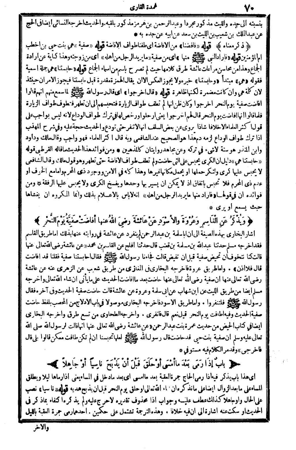 ويُذْكَرُ عَنِ القَاسِمِ وَعُرْوَةَ والأسْوَدِ عنْ عَائِشَةَ رَضِي الله تَعَالَى عَنْهَا أفاضَتْ صَفِيَّةُ يَوْمَ النَّحْرِ