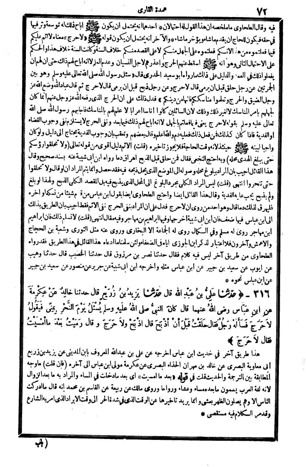 5371 - حدَّثنا عَلِيُّ بنُ عَبْدِ الله قَالَ حدَّثنا يَزِيدُ بنُ زُرَيْعٍ قَالَ حدَّثنا خالِدٌ عَنْ عِكْرِمَةَ عنِ ابنِ عَبَّاسٍ رَضِي الله تَعَالَى عَنْهُمَا قَالَ كانَ النبيُّ صلى الله عَلَيْهِ وَسلم يُسْئَلُ يَوْمَ النَّحْرِ بِمِنىً فيَقُولْ لاَ حَرَجَ فسَألَهُ رَجُلٌ فَقَالَ حَلَقْتُ قَبْلَ أنْ أذْبَحْ ولاَ حَرَجَ وَقَالَ رَمَيْتُ بَعْدَ مَا أمْسَيْتُ فَقَالَ لَا حَرَجَ..