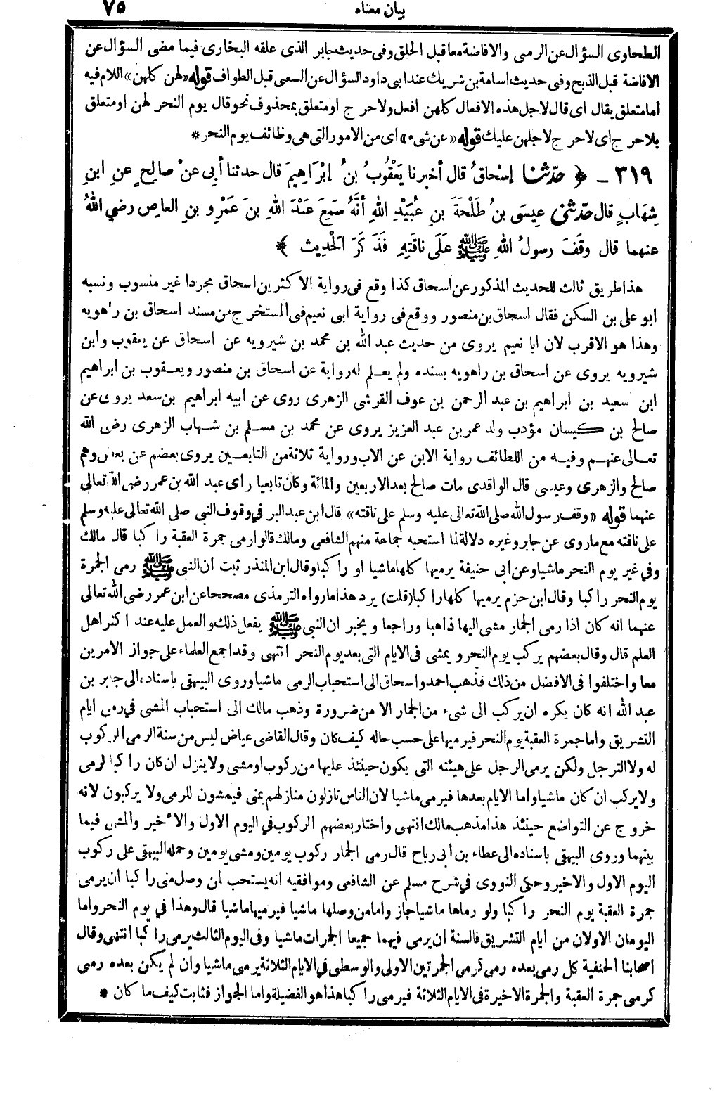 8371 - حدَّثنا إسْحَاقُ قَالَ أخبرنَا يَعْقُوبُ بنُ إبْرَاهِيمَ قَالَ حدَّثنا أبِي عنْ صالِحٍ عنِ ابنِ شِهَابٍ قَالَ حدَّثني عِيسَى بنُ طَلْحَةَ بنِ عُبَيْدِ الله أنَّهُ سَمِعَ عَبْدَ الله بنَ عَمْرِو بنِ العاصِ رَضِي الله تَعَالَى عَنْهُمَا قَالَ وقَفَ رسولُ الله صلى الله عَلَيْهِ وَسلم عَلَى ناقَتِهِ فَذَكَرَ الْحَدِيثَ..