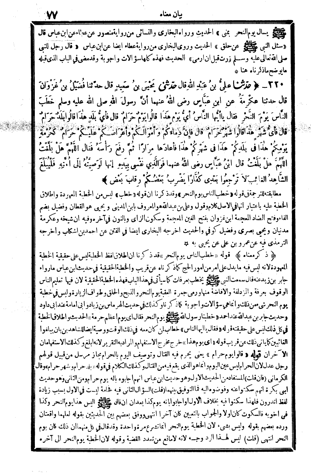 320 - (حَدثنَا عَليّ بن عبد الله قَالَ حَدثنِي يحيى بن سعيد قَالَ حَدثنَا فُضَيْل بن غَزوَان قَالَ حَدثنَا عِكْرِمَة عَن ابْن عَبَّاس رَضِي الله عَنْهُمَا أَن رَسُول الله - صَلَّى اللَّهُ عَلَيْهِ وَسَلَّم َ - خطب النَّاس يَوْم النَّحْر فَقَالَ يَا أَيهَا النَّاس أَي يَوْم هَذَا قَالُوا يَوْم حرَام قَالَ فَأَي بلد هَذَا قَالُوا بلد حرَام قَالَ فَأَي شهر هَذَا قَالُوا شهر حرَام قَالَ فَإِن دماءكم وَأَمْوَالكُمْ وَأَعْرَاضكُمْ عَلَيْكُم حرَام كَحُرْمَةِ يومكم هَذَا فِي بلدكم هَذَا فِي شهركم هَذَا فَأَعَادَهَا مرَارًا ثمَّ رفع رَأسه فَقَالَ اللَّهُمَّ هَل بلغت اللَّهُمَّ هَل بلغت قَالَ ابْن عَبَّاس رَضِي الله عَنْهُمَا فوالذي نَفسِي بِيَدِهِ إِنَّهَا لوصيته إِلَى أمته فليبلغ الشَّاهِد الْغَائِب لَا ترجعوا بعدِي كفَّارًا يضْرب بَعْضكُم رِقَاب بعض) مطابقته للتَّرْجَمَة فِي قَوْله " خطب النَّاس يَوْم النَّحْر " وَقد ذكرنَا أَن قَوْله " خطب " لَيْسَ من الْخطْبَة الْمَعْهُودَة وَإِطْلَاق الْخطْبَة عَلَيْهِ بِاعْتِبَار أَنَّهَا فِي الأَصْل كَلَام وَقَول وَعلي بن عبد الله هُوَ الْمَعْرُوف بِابْن الْمَدِينِيّ وَيحيى هُوَ الْقطَّان وفضيل بِضَم الْفَاء وَفتح الضَّاد الْمُعْجَمَة ابْن غَزوَان بِفَتْح الْغَيْن الْمُعْجَمَة وَسُكُون الزَّاي وبالنون فِي آخِره وَفِيه أَن شيخ وَعِكْرِمَة مدنيان وَيحيى بَصرِي وفضيل كُوفِي والْحَدِيث أخرجه البُخَارِيّ أَيْضا فِي الْفِتَن عَن أَحْمد بن أشكاب وَأخرجه التِّرْمِذِيّ فِيهِ عَن عَمْرو بن عَليّ عَن يحيى بِهِ. (ذكر مَعْنَاهُ) قَوْله " خطب النَّاس يَوْم النَّحْر " قد ذكرنَا أَن إِطْلَاق لفظ الْخطْبَة لَيْسَ على حَقِيقَة الْخطْبَة الْمَعْهُودَة لِأَنَّهُ لَيْسَ فِيهِ مَا يدل على أَمر من أُمُور الْحَج كَمَا ذَكرْنَاهُ عَن قريب وَالْخطْبَة الْحَقِيقِيَّة فِي حَدِيث ابْن عَبَّاس مَا رَوَاهُ جَابر بن زيد عَنهُ قَالَ سَمِعت النَّبِي - صَلَّى اللَّهُ عَلَيْهِ وَسَلَّم َ - يخْطب بِعَرَفَات كَمَا سَيَأْتِي فِي هَذَا الْبَاب فَهَذِهِ الْخطْبَة الْحَقِيقِيَّة لِأَن فِيهَا تَعْلِيم النَّاس الْوُقُوف بِعَرَفَة والمزدلفة والإفاضة مِنْهَا وَرمي جَمْرَة الْعقبَة يَوْم النَّحْر وَالذّبْح وَالْحلق وَطواف الزِّيَارَة وَلَيْسَ فِي خطْبَة يَوْم النَّحْر شَيْء من ذَلِك وَإِنَّمَا هِيَ سُؤَالَات وأجوبة كَمَا ذكرنَا وَكَذَلِكَ فِي حَدِيث الهرماس بن زِيَاد وَأبي أُمَامَة عِنْد أبي دَاوُد وَحَدِيث جَابر بن عبد الله عِنْد أَحْمد " خَطَبنَا رَسُول الله - صَلَّى اللَّهُ عَلَيْهِ وَسَلَّم َ - يَوْم النَّحْر فَقَالَ أَي يَوْم أعظم حُرْمَة " الحَدِيث وَإِطْلَاق الْخطْبَة فِي كل ذَلِك لَيْسَ على حَقِيقَته قَوْله " فَقَالَ يَا أَيهَا النَّاس " خطاب لمن كَانَ مَعَه فِي ذَلِك الْوَقْت وَوَصِيَّة أَيْضا للشاهدين بِأَن يبلغُوا الغائبين كَمَا يَأْتِي ذَلِك عَن قريب قَوْله " أَي يَوْم هَذَا " خرج مخرج الِاسْتِفْهَام وَالْمرَاد بِهِ التَّقْدِير لِأَنَّهُ أبلغ وَكَذَلِكَ الاستفهامان الْآخرَانِ قَوْله " قَالُوا يَوْم حرَام " يَعْنِي يحرم فِيهِ الْقِتَال وتوصيف الْيَوْم بالحرام مجَاز مُرْسل من قبيل قَوْلهم رجل عدل لِأَن الْحَرَام لَيْسَ عين الْيَوْم وَإِنَّمَا هُوَ الَّذِي يَقع فِيهِ من الْقِتَال وَكَذَلِكَ الْكَلَام فِي قَوْله " بلد حرَام وَشهر حرَام " وَقَالَ الْكرْمَانِي (فَإِن قلت) الْمُسْتَفَاد من الحَدِيث الأول وَهُوَ حَدِيث ابْن عَبَّاس أَنهم أجابوه بِأَنَّهُ يَوْم حرَام وَمن الثَّانِي وَهُوَ حَدِيث أبي بكرَة أَنهم سكتوا عَنهُ وفوضوه إِلَيْهِ فَمَا التَّوْفِيق بَينهمَا (قلت) السُّؤَال الثَّانِي فِيهِ فخامة لَيست فِي الأول بِسَبَب زِيَادَة لفظ أَتَدْرُونَ فَلهَذَا سكتوا فِيهِ بِخِلَاف الأول وَأَجَابُوا بِأَنَّهُ يَ