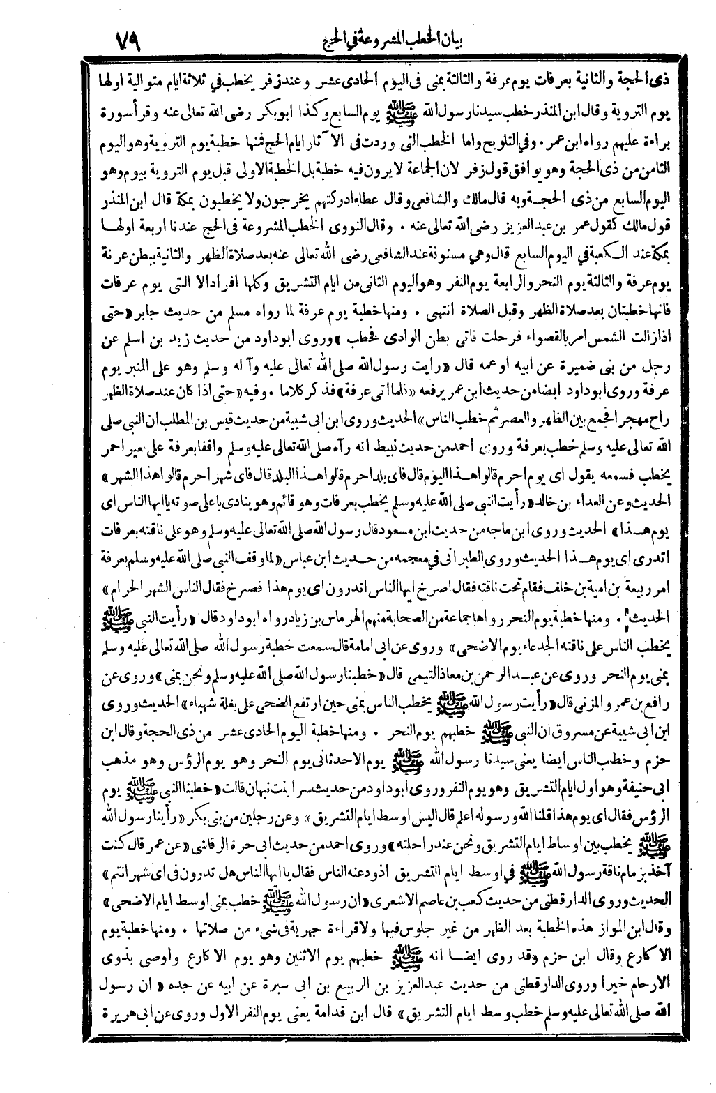 ذِي الْحجَّة وَالثَّانيَِة بِعَرَفَات يَوْم عَرَفَة وَالثَّالِثَة بمنى فِي الْيَوْم الْحَادِي عشر وَعند زفر يخْطب فِي ثَلَاثَة أَيَّام مُتَوَالِيَة أَولهَا يَوْم التَّرويَة وَقَالَ ابْن الْمُنْذر خطب سيدنَا رَسُول الله - صَلَّى اللَّهُ عَلَيْهِ وَسَلَّم َ - يَوْم السَّابِع وَكَذَا أَبُو بكر رَضِي الله تَعَالَى عَنهُ وَقَرَأَ سُورَة بَرَاءَة عَلَيْهِم رَوَاهُ ابْن عمر. وَفِي التَّلْوِيح وَأما الْخطب الَّتِي وَردت فِي الْآثَار أَيَّام الْحَج فَمِنْهَا خطْبَة يَوْم التَّرويَة وَهُوَ الْيَوْم الثَّامِن من ذِي الْحجَّة وَهُوَ يُوَافق قَول زفر لِأَن الْجَمَاعَة لَا يرَوْنَ فِيهِ خطْبَة بل الْخطْبَة الأولى قبل يَوْم التَّرويَة بِيَوْم وَهُوَ الْيَوْم السَّابِع من ذِي الْحجَّة وَبِه قَالَ مَالك وَالشَّافِعِيّ وَقَالَ عَطاء أدركتهم يخرجُون وَلَا يخطبون بِمَكَّة قَالَ ابْن الْمُنْذر قَول مَالك كَقَوْل عمر بن عبد الْعَزِيز رَضِي الله تَعَالَى عَنهُ. وَقَالَ النَّوَوِيّ الْخطب الْمَشْرُوعَة فِي الْحَج عندنَا أَرْبَعَة أَولهَا بِمَكَّة عِنْد الْكَعْبَة فِي الْيَوْم السَّابِع قَالَ وَهِي مسنونة عِنْد الشَّافِعِي رَضِي الله تَعَالَى عَنهُ بعد صَلَاة الظّهْر وَالثَّانيَِة بِبَطن عُرَنَة يَوْم عَرَفَة وَالثَّالِثَة يَوْم النَّحْر وَالرَّابِعَة يَوْم النَّفر وَهُوَ الْيَوْم الثَّانِي من أَيَّام التَّشْرِيق وَكلهَا أَفْرَاد إِلَّا الَّتِي يَوْم عَرَفَات فَإِنَّهَا خطبتان بعد صَلَاة الظّهْر وَقبل الصَّلَاة انْتهى. وَمِنْهَا خطْبَة يَوْم عَرَفَة لما رَوَاهُ مُسلم من حَدِيث جَابر " حَتَّى إِذا زَالَت الشَّمْس أَمر بالقصواء فرحلت فَأتى بطن الْوَادي فَخَطب " وروى أَبُو دَاوُد من حَدِيث زيد بن أسلم عَن رجل من بني ضميرَة عَن أَبِيه أَو عَمه قَالَ " رَأَيْت رَسُول الله - صَلَّى اللَّهُ عَلَيْهِ وَسَلَّم َ - وَهُوَ على الْمِنْبَر يَوْم عَرَفَة وروى أَبُو دَاوُد أَيْضا من حَدِيث ابْن عمر يرفعهُ " فَلَمَّا أَتَى عَرَفَة " فَذكر كلَاما. وَفِيه " حَتَّى إِذا كَانَ عِنْد صَلَاة الظّهْر رَاح مهجرا فَجمع بَين الظّهْر وَالْعصر ثمَّ خطب النَّاس " الحَدِيث وروى ابْن أبي شيبَة من حَدِيث قيس بن الْمطلب أَن النَّبِي - صَلَّى اللَّهُ عَلَيْهِ وَسَلَّم َ - خطب بِعَرَفَة وروى أَحْمد من حَدِيث نبيط أَنه رَآهُ - صَلَّى اللَّهُ عَلَيْهِ وَسَلَّم َ - وَاقِفًا بِعَرَفَة على بعير أَحْمَر يخْطب فَسَمعهُ يَقُول أَي يَوْم أحرم قَالُوا هَذَا الْيَوْم قَالَ فَأَي بلد أحرم قَالُوا هَذَا الْبَلَد قَالَ فَأَي شهر أحرم قَالُوا هَذَا الشَّهْر " الحَدِيث وَعَن العداء بن خَالِد " رَأَيْت النَّبِي - صَلَّى اللَّهُ عَلَيْهِ وَسَلَّم َ - يخْطب بِعَرَفَات وَهُوَ قَائِم وَهُوَ يُنَادي بِأَعْلَى صَوته يَا أَيهَا النَّاس أَي يَوْم هَذَا " الحَدِيث وروى ابْن ماجة من حَدِيث ابْن مَسْعُود قَالَ رَسُول الله - صَلَّى اللَّهُ عَلَيْهِ وَسَلَّم َ - وَهُوَ على نَاقَته بِعَرَفَات أَتَدْرِي أَي يَوْم هَذَا الحَدِيث وروى الطَّبَرَانِيّ فِي مُعْجَمه من حَدِيث ابْن عَبَّاس " لما وقف النَّبِي - صَلَّى اللَّهُ عَلَيْهِ وَسَلَّم َ - بِعَرَفَة أَمر ربيعَة بن أُميَّة بن خلف فَقَامَ تَحت نَاقَته فَقَالَ اُصْرُخْ أَيهَا النَّاس أَتَدْرُونَ أَي يَوْم هَذَا فَصَرَخَ فَقَالَ النَّاس الشَّهْر الْحَرَام " الحَدِيث. وَمِنْهَا خطْبَة يَوْم النَّحْر رَوَاهَا جمَاعَة من الصَّحَابَة مِنْهُم الهرماس بن زِيَاد رَوَاهُ أَبُو دَاوُد قَالَ " رَأَيْت النَّبِي - صَلَّى اللَّهُ عَلَيْهِ وَسَلَّم َ - يخْطب النَّاس على نَاقَته الجدعاء يَوْم الْأَضْحَى " وروى عَن أبي أُمَامَة قَالَ سَمِعت خطْبَة رَسُول الله - صَلَّى اللَّهُ عَلَيْهِ وَسَلَّم َ - بمنى يَوْم النَّحْر وروى عَن عبد الرَّحْمَن بن معَاذ التَّيْمِيّ قَال
