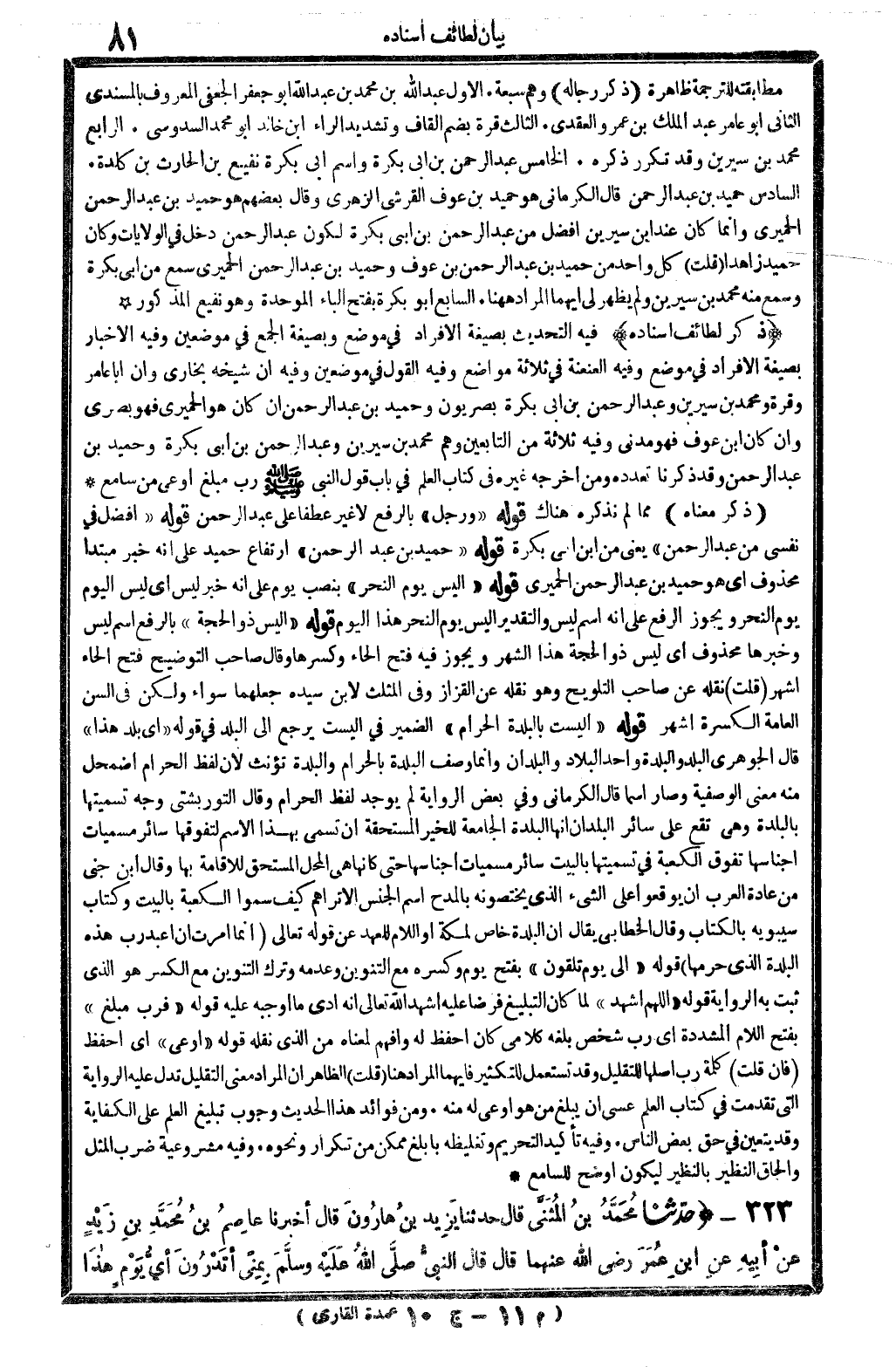 ذكر لطائف إِسْنَاده: فِيهِ: التحديث بِصِيغَة الْإِفْرَاد فِي مَوضِع وبصيغة الْجمع فِي موضِعين. وَفِيه: الْإِخْبَار بِصِيغَة الْإِفْرَاد فِي مَوضِع. وَفِيه: العنعنة فِي ثَلَاثَة مَوَاضِع. وَفِيه: القَوْل فِي موضِعين. وَفِيه: أَن شَيْخه بخاري وَأَن أَبَا عَامر وقرة وَمُحَمّد بن سِيرِين وَعبد الرَّحْمَن بن أبي بكرَة بصريون، وَحميد بن عبد الرَّحْمَن إِن كَانَ هُوَ الْحِمْيَرِي فَهُوَ بَصرِي وَإِن كَانَ ابْن عَوْف فَهُوَ مدنِي. وَفِيه: ثَلَاثَة من التَّابِعين وهم: مُحَمَّد بن سِيرِين وَعبد الرَّحْمَن بن أبي بكرَة وَحميد بن عبد الرَّحْمَن.
