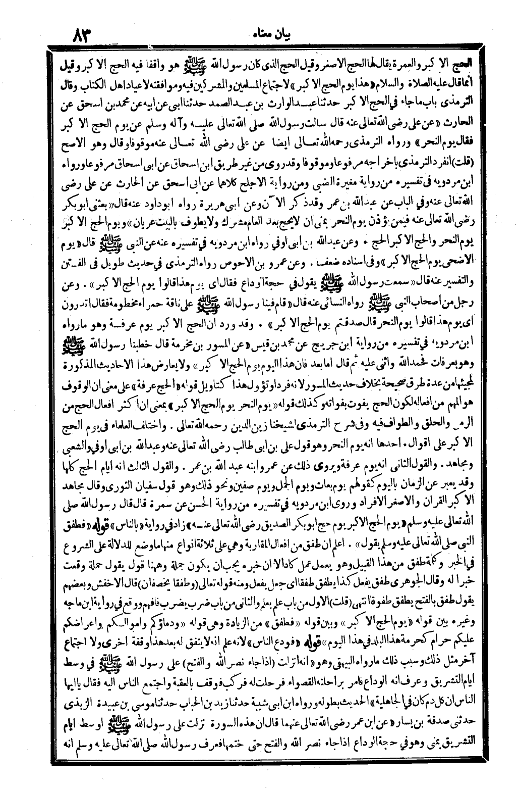 وَقَالَ التِّرْمِذِيّ: بَاب مَا جَاءَ فِي الْحَج الْأَكْبَر: حَدثنَا عبد الْوَارِث بن عبد الصَّمد حَدثنَا أبي عَن أَبِيه عَن مُحَمَّد بن إِسْحَاق عَن الْحَارِث (عَن عَليّ، رَضِي الله تَعَالَى عَنهُ، قَالَ: سَأَلت رَسُول الله، صلى الله عَلَيْهِ وَسلم، عَن يَوْم الْحَج الْأَكْبَر؟ فَقَالَ: يَوْم النَّحْر) . وَرَوَاهُ التِّرْمِذِيّ، رَحمَه الله تَعَالَى أَيْضا عَن عَليّ، رَضِي الله تَعَالَى عَنهُ، مَوْقُوفا، وَقَالَ: وَهُوَ الْأَصَح. قلت: انْفَرد التِّرْمِذِيّ بِإِخْرَاجِهِ مَرْفُوعا وموقوفا، وَقد رُوِيَ من غير طَرِيق ابْن إِسْحَاق عَن أبي إِسْحَاق مَرْفُوعا، وَرَوَاهُ ابْن مرْدَوَيْه فِي تَفْسِيره من رِوَايَة مُغيرَة الضَّبِّيّ، وَمن رِوَايَة الْأَجْلَح كِلَاهُمَا عَن أبي إِسْحَاق عَن الْحَارِث عَن عَليّ، رَضِي الله تَعَالَى عَنهُ، وَفِي الْبَاب عَن عبد الله بن عمر، وَقد ذكر الْآن وَعَن أبي هُرَيْرَة رَوَاهُ أَبُو دَاوُد عَنهُ، قَالَ: (بَعَثَنِي أَبُو بكر، رَضِي الله تَعَالَى عَنهُ، فِيمَن يُؤذن يَوْم النَّحْر بمنى أَن لَا يحجّ بعد الْعَام مُشْرك وَلَا يطوف بِالْبَيْتِ عُرْيَان) . وَيَوْم الْحَج الْأَكْبَر يَوْم النَّحْر، وَالْحج الْأَكْبَر الْحَج. وَعَن عبد الله بن أبي أوفى رَوَاهُ ابْن مرْدَوَيْه فِي تَفْسِيره عَنهُ عَن النَّبِي صلى الله عَلَيْهِ وَسلم قَالَ: (يَوْم الْأَضْحَى يَوْم الْحَج الْأَكْبَر) . وَفِي إِسْنَاده ضعف. وَعَن عَمْرو بن الْأَحْوَص رَوَاهُ التِّرْمِذِيّ فِي حَدِيث طَوِيل فِي الْفِتَن وَالتَّفْسِير عَنهُ قَالَ: (سَمِعت رَسُول الله صلى الله عَلَيْهِ وَسلم يَقُول فِي حجَّة الْوَدَاع، فَقَالَ: أَي يَوْم هَذَا قَالُوا: يَوْم الْحَج الْأَكْبَر) . وَعَن رجل من أَصْحَاب النَّبِي صلى الله عَلَيْهِ وَسلم، رَوَاهُ النَّسَائِيّ عَنهُ، قَالَ: (قَامَ فِينَا رَسُول الله صلى الله عَلَيْهِ وَسلم على نَاقَة حَمْرَاء مخطومة، فَقَالَ: أَتَدْرُونَ أَي يَوْم هَذَا؟ قَالُوا: يَوْم النَّحْر. قَالَ: صَدقْتُمْ يَوْم الْحَج الْأَكْبَر) . وَقد ورد أَن الْحَج الْأَكْبَر يَوْم عَرَفَة، وَهُوَ مَا رَوَاهُ ابْن مرْدَوَيْه فِي تَفْسِيره من رِوَايَة ابْن جريج عَن مُحَمَّد بن قيس (عَن الْمسور بن مخرمَة، قَالَ: خَطَبنَا رَسُول الله صلى الله عَلَيْهِ وَسلم وَهُوَ بِعَرَفَات، فَحَمدَ الله وَأثْنى عَلَيْهِ، ثمَّ قَالَ: أما بعد فَإِن هَذَا الْيَوْم يَوْم الْحَج الْأَكْبَر) ، وَلَا يُعَارض هَذَا الْأَحَادِيث الْمَذْكُورَة لمجيئها من عدَّة طرق صَحِيحَة، بِخِلَاف حَدِيث الْمسور لِأَنَّهُ فَردا، وتؤول هَذَا كتأويل قَوْله: (الْحَج عَرَفَة) ، على معنى أَن الْوُقُوف هُوَ المهم من أَفعاله، لكَون الْحَج يفوت بفواته، وَكَذَلِكَ قَوْله: (يَوْم النَّحْر يَوْم الْحَج الْأَكْبَر) ، بِمَعْنى أَن أَكثر أَفعَال الْحَج من الرَّمْي وَالْحلق وَالطّواف فِيهِ، وَفِي (شرح التِّرْمِذِيّ) لشَيْخِنَا زين الدّين، رَحمَه الله تَعَالَى.