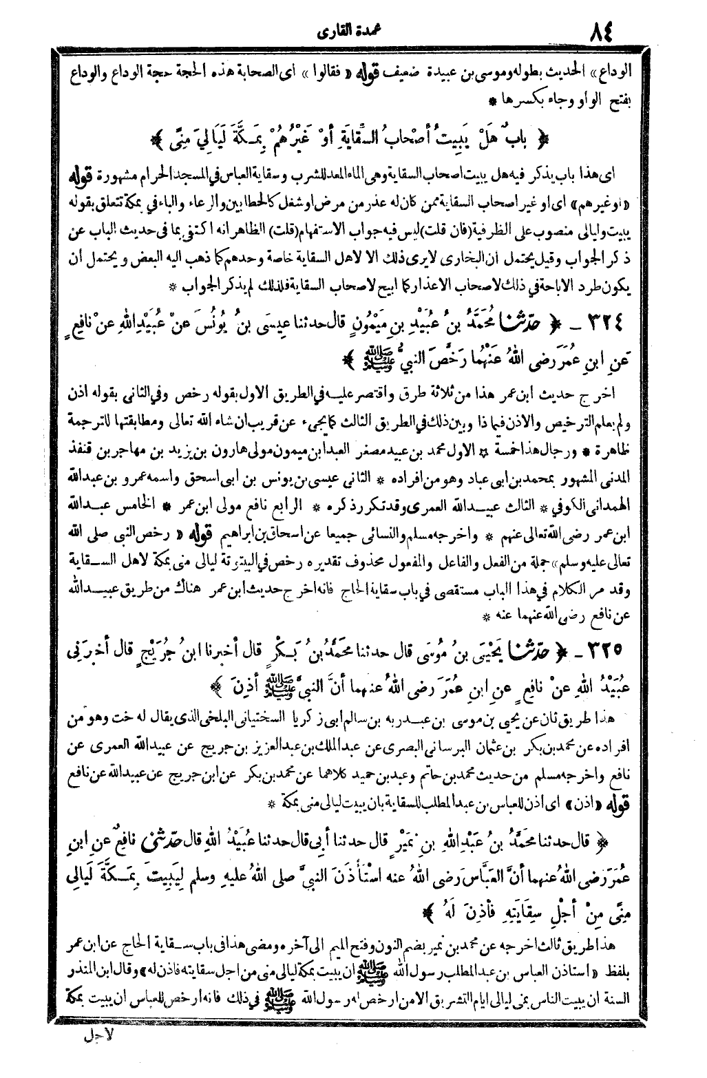 5471 - قَالَ حدَّثنا مُحَمَّدُ بنُ عَبْدِ الله بنِ نمَيْرٍ قَالَ حَدثنَا أبِي قَالَ حَدثنَا عُبَيْدُ الله قَالَ حدَّثني نافِعٌ عنِ ابنِ عُمَرَ رَضِي الله تَعَالَى عَنْهُمَا أنَّ العَبَّاسَ رَضِي الله تَعَالَى عنهُ اسْتَأْذَنَ النبيَّ صلى الله عَلَيْهِ وَسلم لِيَبِيتَ بِمَكَّةَ لَيالِي مِنىً مِنْ أجْلِ سِقَايَتِهِ فأذِنَ لَهُ..