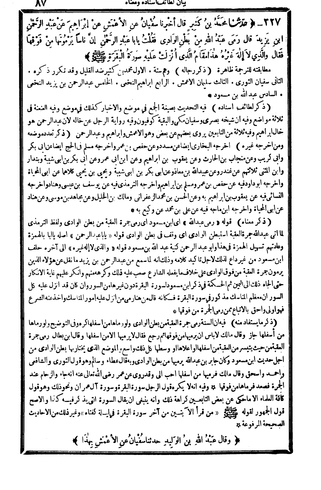 7471 - حدَّثنا مُحَمَّدُ بنُ كَثِيرٍ قَالَ أخْبرَنا سُفْيَانُ عنِ الأعْمَشِ عنْ إبْرَاهِيمَ عَنْ عَبْدِ الرَّحْمانِ ابنِ يَزيدَ قَالَ رَمَى عَبْدُ الله منْ بَطْنِ الوَادِي فَقُلْتُ يابا عَبْدِ الرَّحْمانِ إنَّ نَاسا يَرْمُونَها مِنْ فَوْقِهَا فقَال والَّذِي لاَ إل هـ غَيْرُهُ هاذَا مَقَامُ الَّذِي أُنْزِلَتْ عَلَيْهِ سورَةُ الْبَقَرَةِ صلى الله عَلَيْهِ وَسلم..