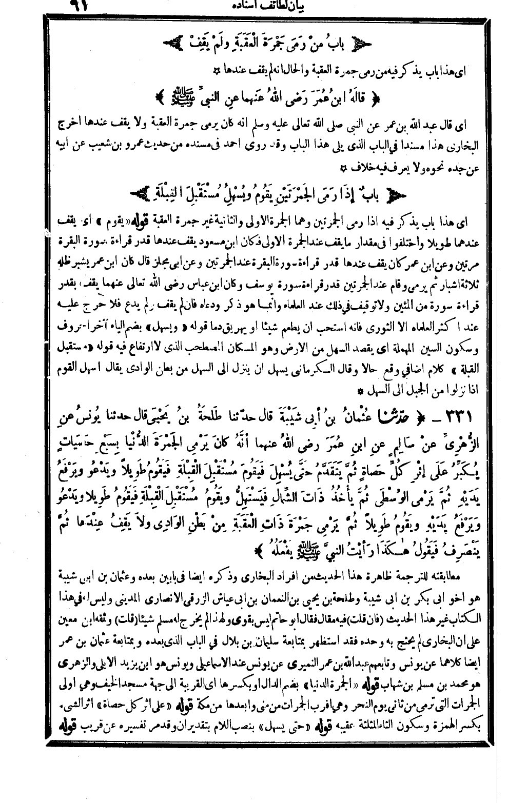 1571 - حدَّثنا عُثْمَانُ بنُ أبِي شَيْبَةَ قَالَ حدَّثنا طَلحَةُ بنُ يَحْيَى قَالَ حَدثنَا يُونسُ عنِ الزُّهْرِيِّ عنْ سَالِمٍ عنِ ابنِ عُمَرَ رَضِي الله تَعَالَى عَنْهُمَا أنَّهُ كانَ يَرْمِي الجَمْرَةَ الدُّنْيَا بِسَبْعِ حَصَياتٍ يُكَبِّرُ عَلَى إثْرِ كُلِّ حَصاةٍ ثُمَّ يَتَقَدَّمُ حَتَّى يُسْهِلَ فَيَقُومَ مُسْتَقْبِلَ الْقِبْلَةِ فَيَقُومُ طَوِيلاً ويَدْعُو ويَرْفَعُ يَدَيْهِ ثُمَّ يَرْمِي الوُسْطَى ثُمَّ يأخُذُ ذَاتَ الشِّمَالِ فَيَسْتَهِلُّ ويَقُومُ مُسْتَقْبِلَ الْقِبْلَةِ فَيَقُومُ طَوِيلاً ويَدْعُو ويَرْفَعُ يَدَيْهِ طَوِيلاً ثُمَّ يَرْمِي جَمْرَةَ ذَاتِ الْعَقَبَةِ مِنْ بَطْنِ الوَادِي ولاَ يَقِفُ عِنْدَهَا ثُمَّ يَنْصَرِفُ فَيَقُولُ هاكَذَا رَأيْتُ النبيَّ صلى الله عَلَيْهِ وَسلم يَفْعَلُهُ.