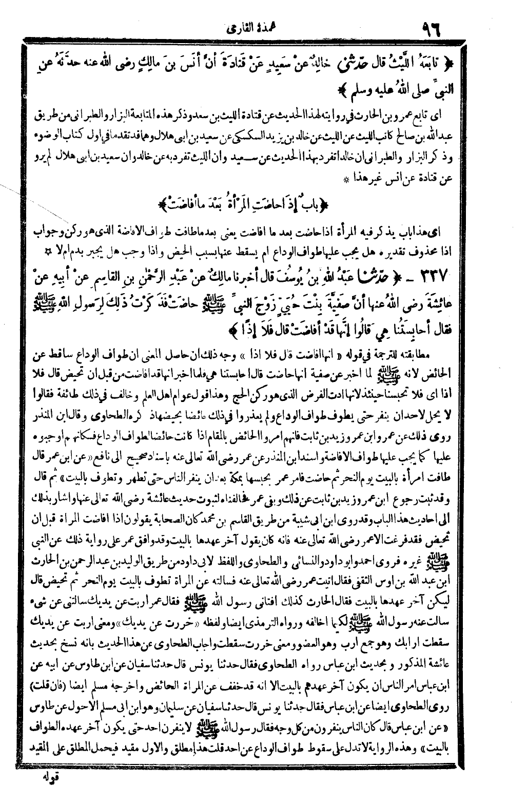 7571 - حدَّثنا عَبْدُ الله بنُ يُوسُفَ قَالَ أخبرنَا مالِكٌ عنْ عَبْدِ الرَّحْمانِ بنِ القَاسِمِ عنْ أبِيهِ عَن عَائِشَةَ رَضِي الله تَعَالَى عَنْهَا أنَّ صَفِيَّةَ بِنْتَ حُيَيٍّ زَوْجَ النبيِّ صلى الله عَلَيْهِ وَسلم حاضَتْ فَذَكَرَتْ ذَلِكَ لِرَسُولِ الله صلى الله عَلَيْهِ وَسلم فَقَالَ أحَابِسَتُنَا هِيَ قالُوا إنَّهَا قَدْ أفَاضَتْ قَالَ فَلاَ إِذا..
