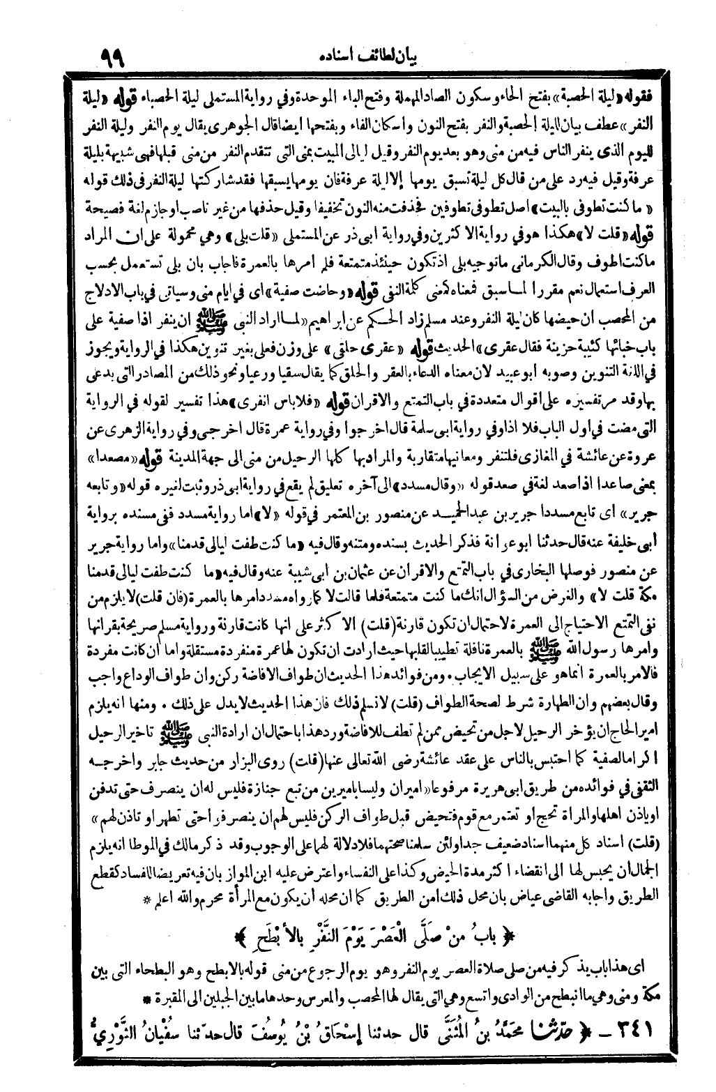 فَقَوله: (لَيْلَة الحصبة) ، بِفَتْح الْحَاء وَسُكُون الصَّاد الْمُهْملَة وَفتح الْبَاء الْمُوَحدَة، وَفِي رِوَايَة الْمُسْتَمْلِي: لَيْلَة الْحَصْبَاء. قَوْله: (لَيْلَة النَّفر) ، عطف بَيَان لليلة الحصبة، والنفر، بِفَتْح النُّون وَإِسْكَان الْفَاء وَبِفَتْحِهَا أَيْضا. قَالَ الْجَوْهَرِي: يُقَال: يَوْم النَّفر وَلَيْلَة النَّفر لليوم النذي ينفر النَّاس فِيهِ من منى، وَهُوَ بعد يَوْم النَّفر، وَقيل: ليَالِي الْمبيت بمنى الَّتِي تتقدم النَّفر من منى قبلهَا، فَهِيَ شَبيهَة بليلة عَرَفَة. وَقيل: فِيهِ رد على من قَالَ: كل لَيْلَة تسبق يَوْمهَا إلاَّ لَيْلَة عَرَفَة، فَإِن يَوْمهَا يسبقها، فقد شاركتها لَيْلَة النَّفر فِي ذَلِك. قَوْله: (مَا كنت تطوفي بِالْبَيْتِ) ، أصل: تطوفي: تطوفين. فحذفت مِنْهُ النُّون تَخْفِيفًا. وَقيل: حذفهَا من غير ناصب أَو جازم لُغَة فصيحة. قَوْله: (قلت: لَا) ، هَكَذَا هُوَ فِي رِوَايَة الْأَكْثَرين، وَفِي رِوَايَة أبي ذَر عَن الْمُسْتَمْلِي: (قلت: بلَى) . وَهِي مَحْمُولَة على أَن المُرَاد: مَا كنت أَطُوف. وَقَالَ الْكرْمَانِي: مَا تَوْجِيه بلَى، إِذْ تكون حِينَئِذٍ متمتعة. فَلم أمرهَا بِالْعُمْرَةِ؟ فَأجَاب: بِأَن: بلَى، تسْتَعْمل بِحَسب الْعرف اسْتِعْمَال نعم، مقررا لما سبق، فَمَعْنَاه كمعنى كلمة النَّفْي. قَوْله: (وحاضت صَفِيَّة) أَي: فِي أَيَّام منى، وَسَيَأْتِي فِي: بَاب الإدلاج من المحصب، أَن حَيْضهَا كَانَ لَيْلَة النَّفر، وَعند مُسلم، زَاد الحكم عَن إِبْرَاهِيم: (لما أَرَادَ النَّبِي صلى الله عَلَيْهِ وَسلم أَن ينفر إِذا صَفِيَّة على بَاب خبائها كئيبة حزينة، فَقَالَ: عقري) الحَدِيث.