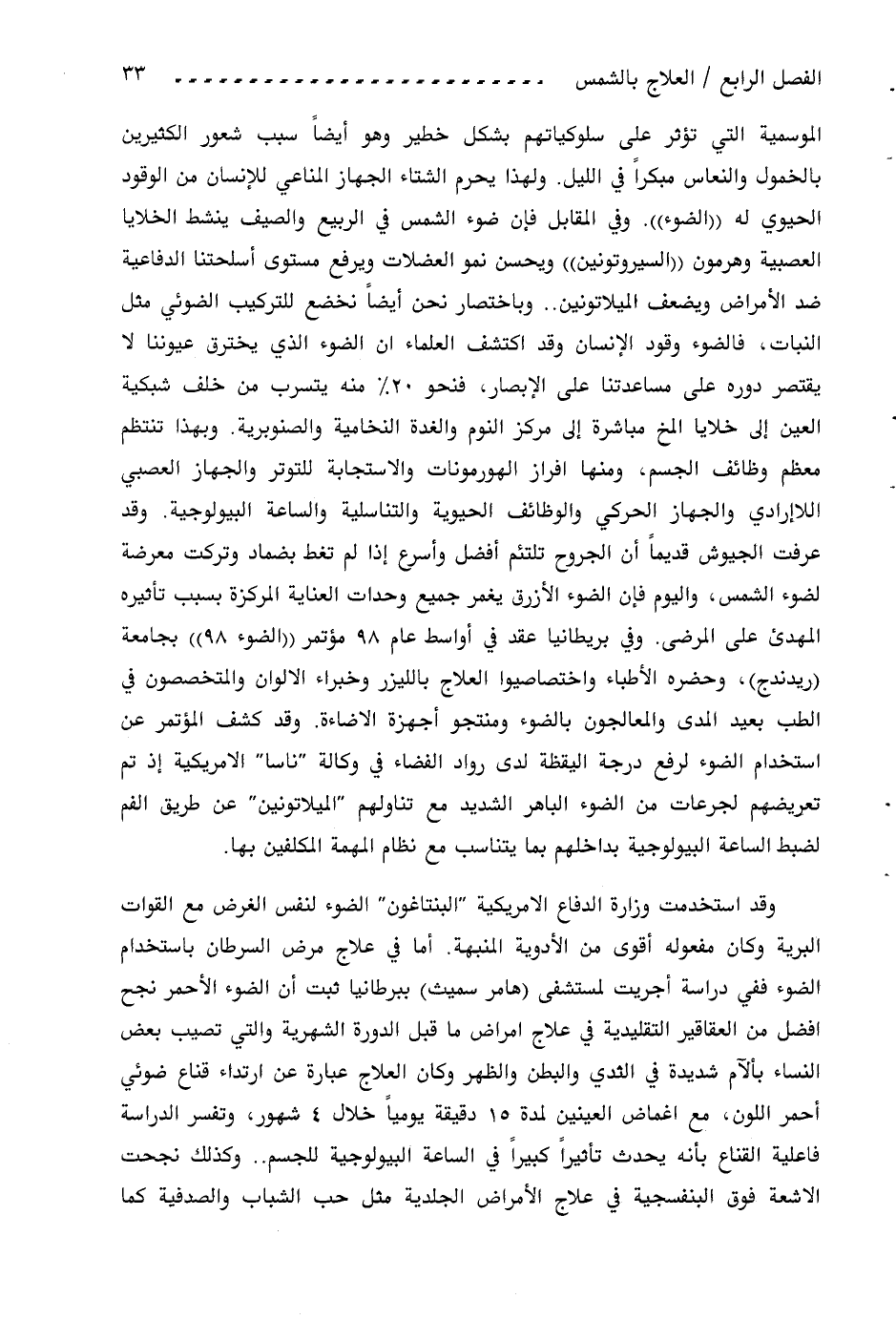 الموسمية التي تؤثر على سلوكياتهم بشكل خطير وهو أيضا سبب شعور الكثيرين بالخمول والنعاس مبكرا في الليل. ولهذا يحرم الشتاء الجهاز المناعي للإنسان من الوقود الحيوي له ((الضوء)). وفي المقابل فإن ضوء الشمس في الربيع والصيف ينشط الخلايا العصبية وهرمون ((السيروتونين)) ويحسن نمو العضلات ويرفع مستوى أسلحتنا الدفاعية ضد الأمراض ويضعف الميلاتونين .. وباختصار نحن أيضا نخضع للتركيب الضوئي مثل النبات، فالضوء وقود الإنسان وقد اكتشف العلماء ان الضوء الذي يخترق عيوننا لا يقتصر دوره على مساعدتنا على الإبصار، فنحو 20 خ منه يتسرب من خلف شبكية العين إلى خلايا المخ مباشرة إلى مركز النوم والغدة النخامية والصنوبرية. وبهذا تنتظم معظم وظائف الجسم، ومنها افراز الهورمونات والاستجابة للتوتر والجهاز العصبي اللاإرادي والجهاز الحركي والوظائف الحيوية والتناسلية والساعة البيولوجية. وقد عرفت الجيوش قديما أن الجروح تلتئم أفضل وأسرع إذا لم تغط بضماد وتركت معرضة لضوء الشمس، واليوم فإن الضوء الأزرق يغمر جميع وحدات العناية المركزة بسبب تأثيره المهدئ على المرضى. وفي بريطانيا عقد في أواسط عام 98 مؤتمر ((الضوء 98)) بجامعة (ريدندج)، وحضره الأطباء واختصاصيو العلاج بالليزر وخبراء الالوان والمتخصصون في الطب بعيد المدى والمعالجون بالضوء ومنتجو أجهزة الاضاءة. وقد كشف المؤتمر عن استخدام الضوء لرفع درجة اليقظة لدى رواد الفضاء في وكالة" ناسا" الامريكية إذ تم تعريضهم لجرعات من الضوء الباهر الشديد مع تناولهم" الميلاتونين" عن طريق الفم لضبط الساعة البيولوجية بداخلهم بما يتناسب مع نظام المهمة المكلفين بها.