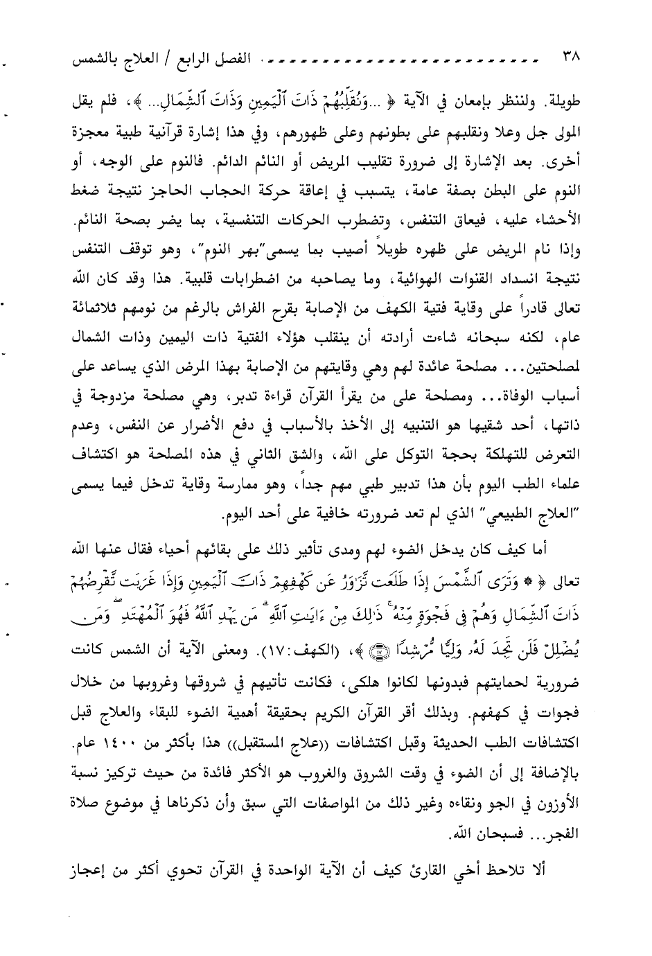 وإذا نام المريض على ظهره طويلا أصيب بما يسمى" بهر النوم"، وهو توقف التنفس نتيجة انسداد القنوات الهوائية، وما يصاحبه من اضطرابات قلبية. هذا وقد كان اللّه تعالى قادرا على وقاية فتية الكهف من الإصابة بقرح الفراش بالرغم من نومهم ثلاثمائة عام، لكنه سبحانه شاءت أرادته أن ينقلب هؤلاء الفتية ذات اليمين وذات الشمال لمصلحتين ... مصلحة عائدة لهم وهي وقايتهم من الإصابة بهذا المرض الذي يساعد على أسباب الوفاة ... ومصلحة على من يقرأ القرآن قراءة تدبر، وهي مصلحة مزدوجة في ذاتها، أحد شقيها هو التنبيه إلى الأخذ بالأسباب في دفع الإضرار عن النفس، وعدم التعرض للتهلكة بحجة التوكل على اللّه، والشق الثاني في هذه المصلحة هو اكتشاف علماء الطب اليوم بأن هذا تدبير طبي مهم جدا، وهو ممارسة وقاية تدخل فيما يسمى" العلاج الطبيعي" الذي لم تعد ضرورته خافية على أحد اليوم.