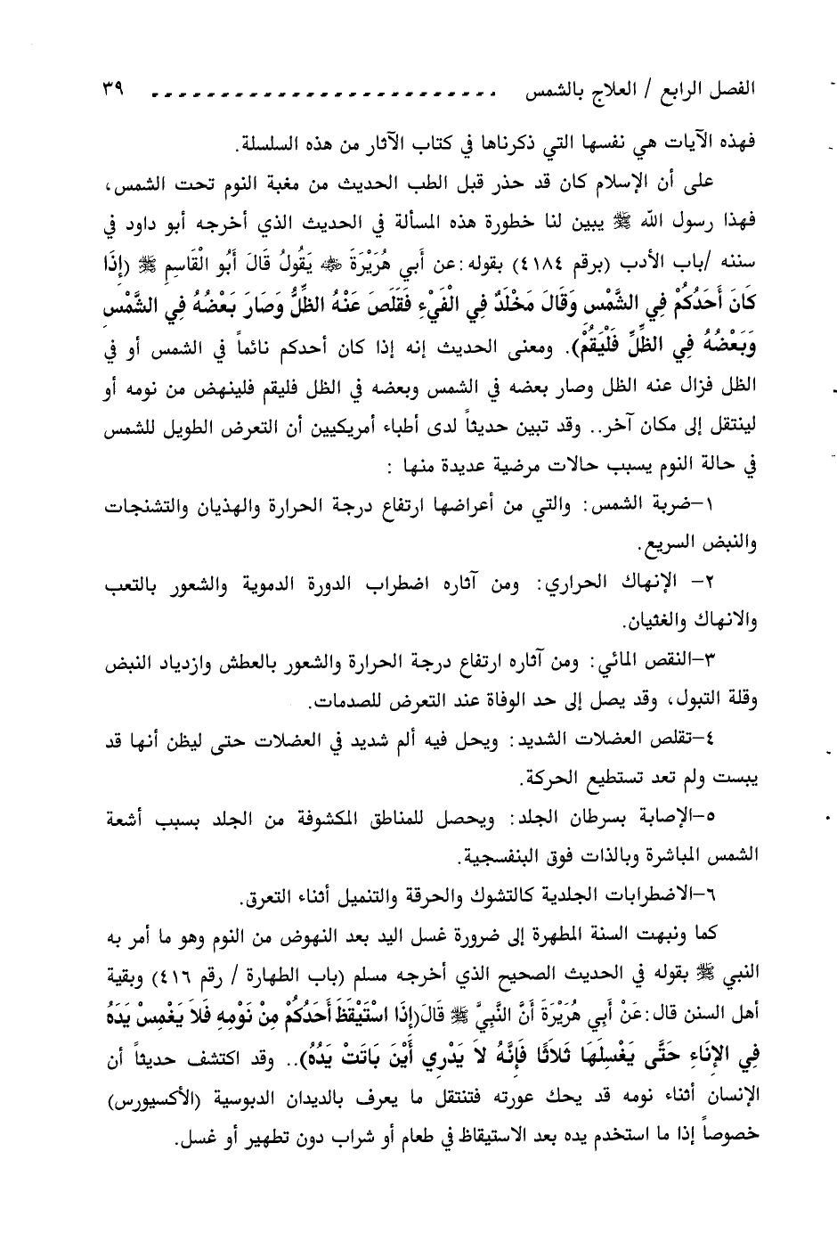 على أن الإسلام كان قد حذر قبل الطب الحديث من مغبة النوم تحت الشمس، فهذا رسول اللّه صلى اللّه عليه وسلم يبين لنا خطورة هذه المسألة في الحديث الذي أخرجه أبو داود في سننه/ باب الأدب (برقم 4184) بقوله: عن أبي هريرة رضي اللّه عنه يقول قال أبو القاسم صلى اللّه عليه وسلم (إذا كان أحدكم في الشّمس وقال مخلد في الفيء فقلص عنه الظّلّ وصار بعضه في الشّمس وبعضه في الظّلّ فليقم). ومعنى الحديث إنه إذا كان أحدكم نائما في الشمس أو في الظل فزال عنه الظل وصار بعضه في الشمس وبعضه في الظل فليقم فلينهض من نومه أو لينتقل إلى مكان آخر .. وقد تبين حديثا لدى أطباء أمريكيين أن التعرض الطويل للشمس في حالة النوم يسبب حالات مرضية عديدة منها: