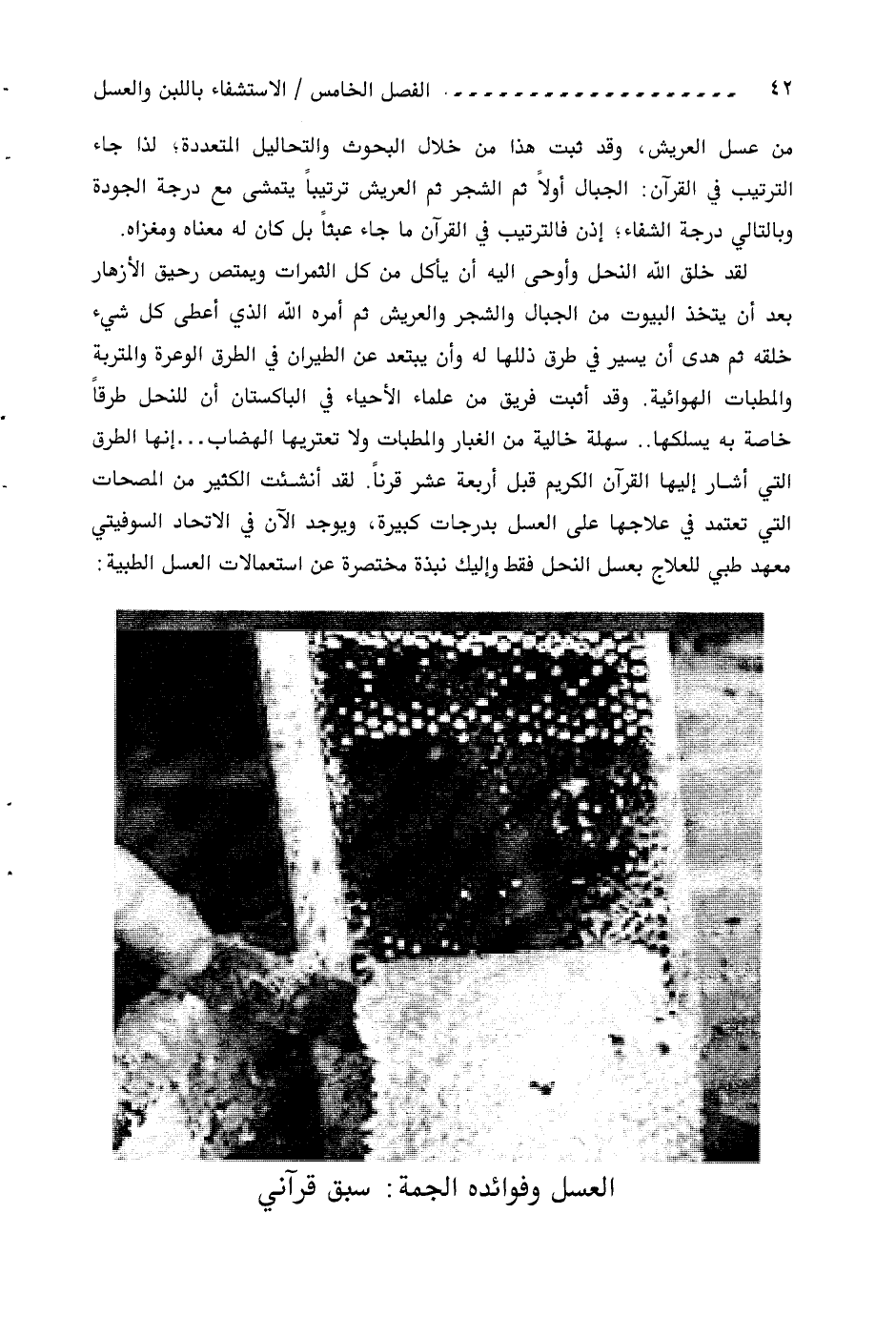 من عسل العريش، وقد ثبت هذا من خلال البحوث والتحاليل المتعددة، لذا جاء الترتيب في القرآن: الجبال أولا ثم الشجر ثم العريش ترتيبا يتمشى مع درجة الجودة وبالتالي درجة الشفاء؛ إذن فالترتيب في القرآن ما جاء عبثا بل كان له معناه ومغزاه.