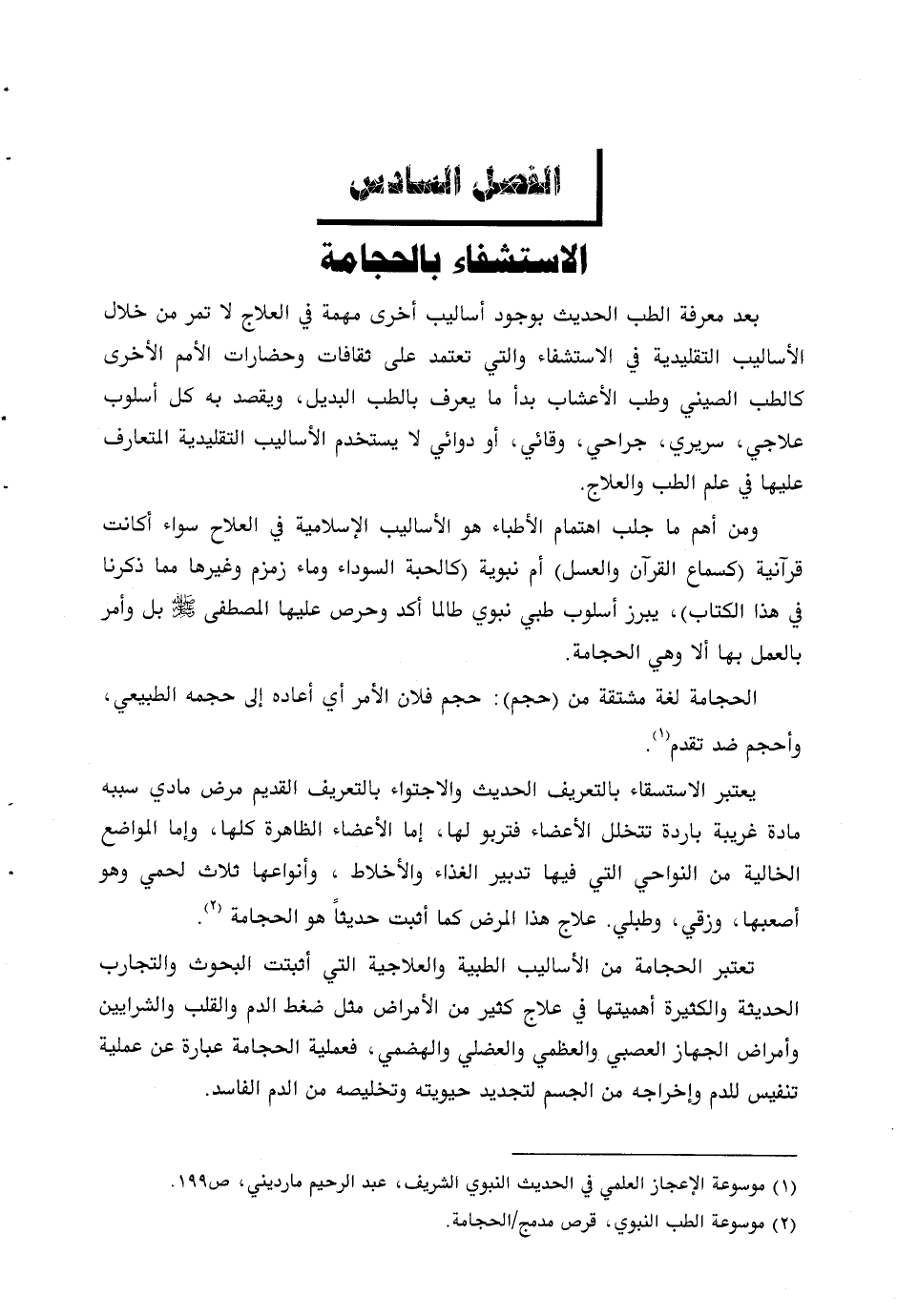 ومن أهم ما جلب اهتمام الأطباء هو الأساليب الإسلامية في العلاج سواء أ كانت قرآنية (كسماع القرآن والعسل) أم نبوية (كالحبة السوداء وماء زمزم وغيرها مما ذكرنا في هذا الكتاب)، يبرز أسلوب طبي نبوي طالما أكد وحرص عليها المصطفى صلى اللّه عليه وسلم بل وأمر بالعمل بها أ لا وهي الحجامة.