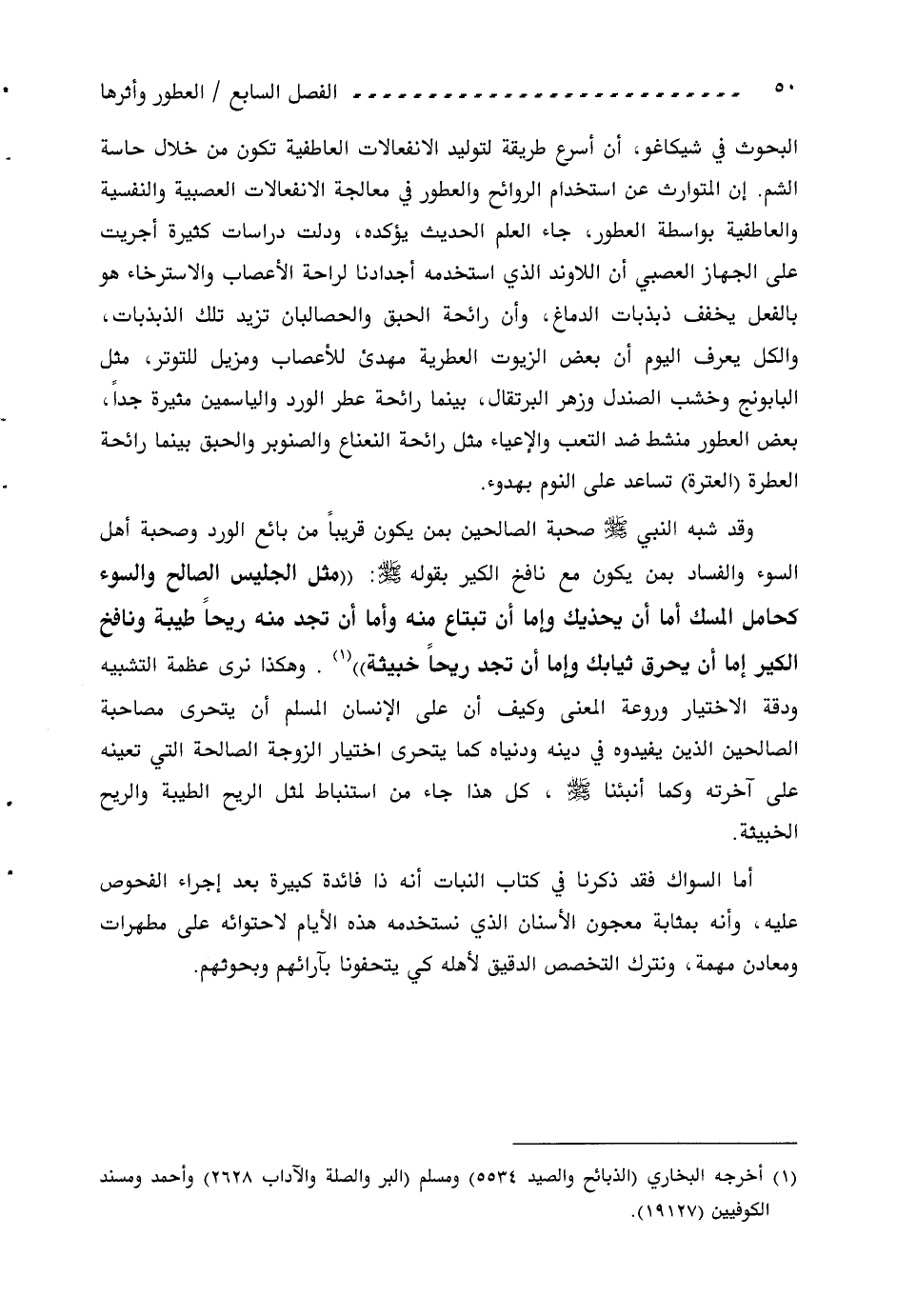 البحوث في شيكاغو، أن أسرع طريقة لتوليد الانفعالات العاطفية تكون من خلال حاسة الشم. إن المتوارث عن استخدام الروائح والعطور في معالجة الانفعالات العصبية والنفسية والعاطفية بواسطة العطور، جاء العلم الحديث يؤكده، ودلت دراسات كثيرة أجريت على الجهاز العصبي أن اللاوند الذي استخدمه أجدادنا لراحة الأعصاب والاسترخاء هو بالفعل يخفف ذبذبات الدماغ، وأن رائحة الحبق والحصالبان تزيد تلك الذبذبات، والكل يعرف اليوم أن بعض الزيوت العطرية مهدئ للأعصاب ومزيل للتوتر، مثل البابونج وخشب الصندل وزهر البرتقال، بينما رائحة عطر الورد والياسمين مثيرة جدا، بعض العطور منشط ضد التعب والإعياء مثل رائحة النعناع والصنوبر والحبق بينما رائحة العطرة (العترة) تساعد على النوم بهدوء.