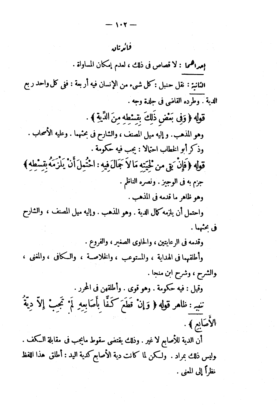 فَائِدَتَانِ إحْدَاهُمَا: لَا قِصَاصَ فِي ذَلِكَ، لِعَدَمِ إمْكَانِ الْمُسَاوَاةِ. الثَّانِيَةُ: نَقَلَ حَنْبَلٌ: كُلُّ شَيْءٍ مِنْ الْإِنْسَانِ فِيهِ أَرْبَعَةٌ: فَفِي كُلِّ وَاحِدٍ رُبُعُ الدِّيَةِ. وَطَرَدَهُ الْقَاضِي فِي جِلْدَةِ وَجْهٍ. قَوْلُهُ (وَفِي بَعْضِ ذَلِكَ بِقِسْطِهِ مِنْ الدِّيَةِ) . وَهُوَ الْمَذْهَبُ. وَإِلَيْهِ مَيْلُ الْمُصَنِّفِ، وَالشَّارِحِ فِي بَحْثِهِمَا. وَعَلَيْهِ الْأَصْحَابُ. وَذَكَرَ أَبُو الْخَطَّابِ احْتِمَالًا: يَجِبُ فِيهِ حُكُومَةٌ. قَوْلُهُ (فَإِنْ بَقِيَ مِنْ لِحْيَتِهِ مَا لَا جَمَالَ فِيهِ: احْتَمَلَ أَنْ يَلْزَمَهُ بِقِسْطِهِ) جَزَمَ بِهِ فِي الْوَجِيزِ. وَنَصَرَهُ النَّاظِمُ. وَهُوَ ظَاهِرُ مَا قَدَّمَهُ فِي الْمَذْهَبِ. وَاحْتَمَلَ أَنْ يَلْزَمَهُ كَمَالُ الدِّيَةِ. وَهُوَ الْمَذْهَبُ. وَإِلَيْهِ مَيْلُ الْمُصَنِّفِ، وَالشَّارِحِ فِي بَحْثِهِمَا، وَقَدَّمَهُ فِي الرِّعَايَتَيْنِ، وَالْحَاوِي الصَّغِيرِ، وَالْفُرُوعِ. وَأَطْلَقَهُمَا فِي الْهِدَايَةِ، وَالْمُسْتَوْعِبِ، وَالْخُلَاصَةِ، وَالْكَافِي، وَالْمُغْنِي، وَالشَّرْحِ، وَشَرْحِ ابْنِ مُنَجَّا. وَقِيلَ: فِيهِ حُكُومَةٌ. وَهُوَ قَوِيٌّ. وَأَطْلَقَهُنَّ فِي الْمُحَرَّرِ.