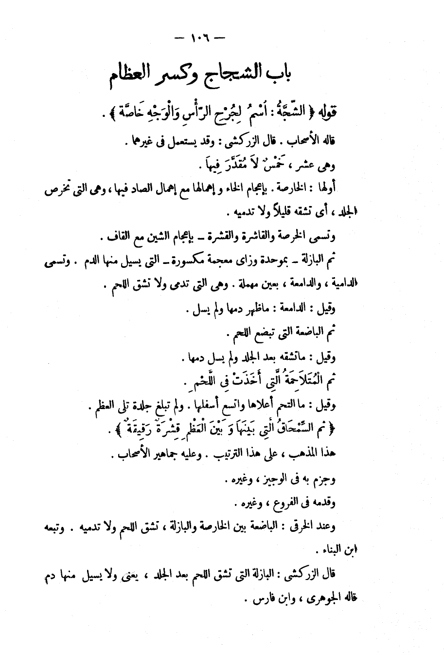 ِ قَوْلُهُ (الشَّجَّةُ: اسْمٌ لِجُرْحِ الرَّأْسِ وَالْوَجْهِ خَاصَّةً) . قَالَهُ الْأَصْحَابُ. قَالَ الزَّرْكَشِيُّ: وَقَدْ يُسْتَعْمَلُ فِي غَيْرِهِمَا. وَهِيَ عَشْرٌ، خَمْسٌ لَا مُقَدَّرَ فِيهَا أَوَّلُهَا: الْخَارِصَةُ. بِإِعْجَامِ الْخَاءِ وَإِهْمَالِهَا مَعَ إهْمَالِ الصَّادِ فِيهَا، وَهِيَ الَّتِي تَخْرُصُ الْجِلْدَ، أَيْ تَشُقُّهُ قَلِيلًا وَلَا تُدْمِيهِ. وَتُسَمَّى الْخُرْصَةَ وَالْقَاشِرَةَ وَالْقِشْرَةَ بِإِعْجَامِ الشِّينِ مَعَ الْقَافِ. ثُمَّ الْبَازِلَةُ بِمُوَحَّدَةٍ وَزَايٍ مُعْجَمَةٍ مَكْسُورَةٍ الَّتِي يَسِيلُ مِنْهَا الدَّمُ. وَتُسَمَّى الدَّامِيَةَ، وَالدَّامِعَةَ، بِعَيْنٍ مُهْمَلَةٍ. وَهِيَ الَّتِي تَدْمَى وَلَا تَشُقُّ اللَّحْمَ. وَقِيلَ: الدَّامِعَةُ: مَا ظَهَرَ دَمُهَا وَلَمْ يَسِلْ. ثُمَّ الْبَاضِعَةُ الَّتِي تُبْضِعُ اللَّحْمَ. وَقِيلَ: مَا تَشُقُّهُ بَعْدَ الْجِلْدِ وَلَمْ يَسِلْ دَمُهَا. ثُمَّ الْمُتَلَاحِمَةُ الَّتِي أَخَذَتْ فِي اللَّحْمِ. وَقِيلَ: مَا الْتَحَمَ أَعْلَاهَا وَاتَّسَعَ أَسْفَلُهَا. وَلَمْ تَبْلُغْ جِلْدَةً تَلِي الْعَظْمَ. (ثُمَّ السِّمْحَاقُ الَّتِي بَيْنَهَا وَبَيْنَ الْعَظْمِ قِشْرَةٌ رَقِيقَةٌ) . هَذَا الْمَذْهَبُ عَلَى هَذَا التَّرْتِيبِ. وَعَلَيْهِ جَمَاهِيرُ الْأَصْحَابِ، وَجَزَمَ بِهِ فِي الْوَجِيزِ، وَغَيْرِهِ، وَقَدَّمَهُ فِي الْفُرُوعِ، وَغَيْرِهِ. وَعِنْدِ الْخِرَقِيِّ: الْبَاضِعَةُ بَيْنَ الْخَارِصَةِ وَالْبَازِلَةِ، تَشُقُّ اللَّحْمَ وَلَا تُدْمِيهِ، وَتَبِعَهُ ابْنُ الْبَنَّاءِ. قَالَ الزَّرْكَشِيُّ: الْبَازِلَةُ الَّتِي تَشُقُّ اللَّحْمَ بَعْدَ الْجِلْدِ، يَعْنِي وَلَا يَسِيلُ مِنْهَا دَمٌ قَالَهُ الْجَوْهَرِيُّ، وَابْنُ فَارِسٍ.