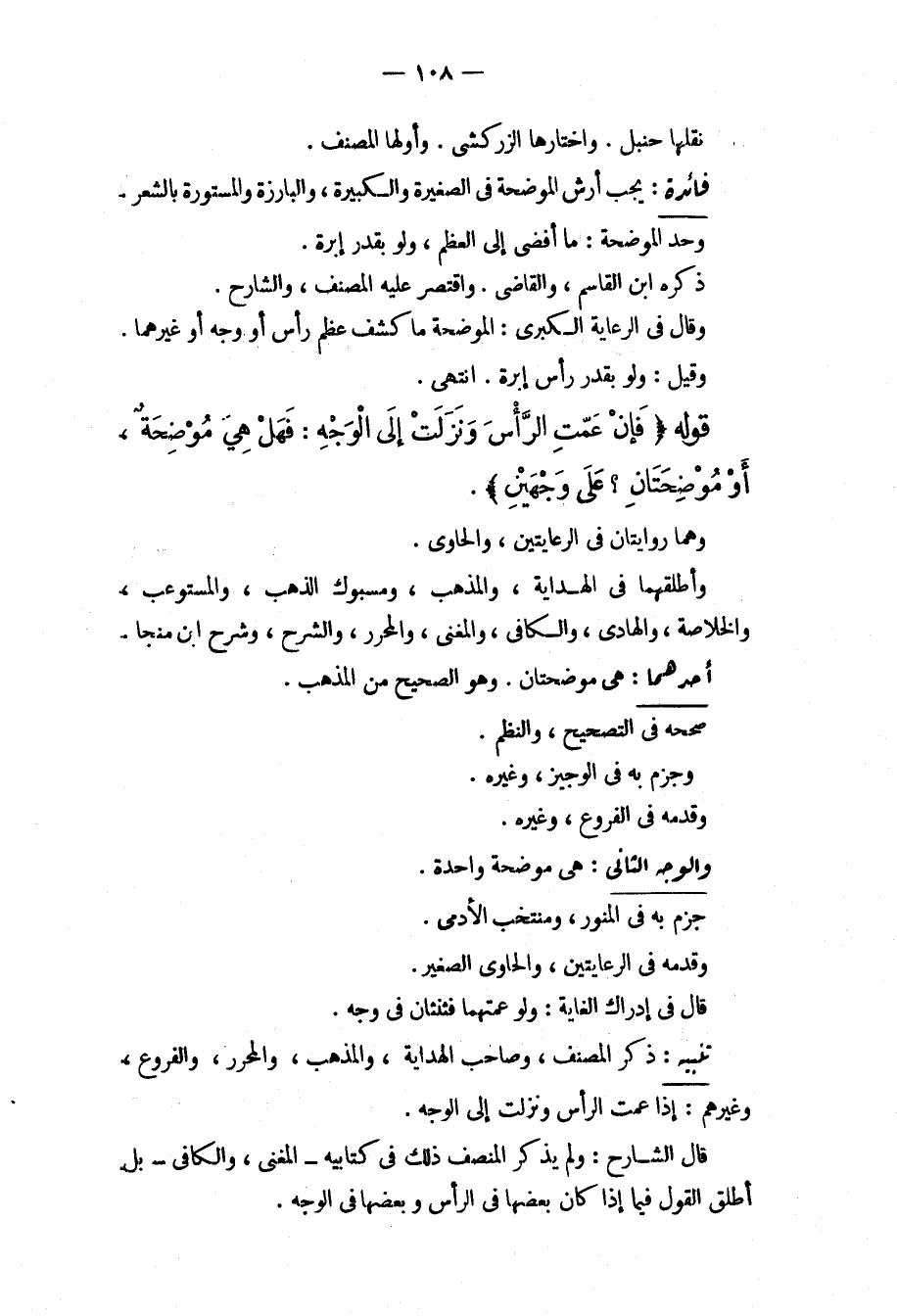 نَقَلَهَا حَنْبَلٌ، وَاخْتَارَهَا الزَّرْكَشِيُّ. وَأَوَّلَهَا الْمُصَنِّفُ. فَائِدَةٌ: يَجِبُ أَرْشُ الْمُوضِحَةِ فِي الصَّغِيرَةِ وَالْكَبِيرَةِ، وَالْبَارِزَةِ وَالْمَسْتُورَةِ بِالشَّعْرِ. وَحَدُّ الْمُوضِحَةِ: مَا أَفْضَى إلَى الْعَظْمِ، وَلَوْ بِقَدْرِ إبْرَةٍ. ذَكَرَهُ ابْنُ الْقَاسِمِ، وَالْقَاضِي. وَاقْتَصَرَ عَلَيْهِ الْمُصَنِّفُ، وَالشَّارِحُ. وَقَالَ فِي الرِّعَايَةِ الْكُبْرَى: الْمُوضِحَةُ مَا كَشَفَ عَظْمَ رَأْسٍ أَوْ وَجْهٍ أَوْ غَيْرِهِمَا. وَقِيلَ: وَلَوْ بِقَدْرِ رَأْسِ إبْرَةٍ. انْتَهَى. قَوْلُهُ (فَإِنْ عَمَّتْ الرَّأْسَ وَنَزَلَتْ إلَى الْوَجْهِ: فَهَلْ هِيَ مُوضِحَةٌ، أَوْ مُوضِحَتَانِ؟ عَلَى وَجْهَيْنِ) . وَهُمَا رِوَايَتَانِ فِي الرِّعَايَتَيْنِ، وَالْحَاوِي. وَأَطْلَقَهُمَا فِي الْهِدَايَةِ، وَالْمُذْهَبِ، وَمَسْبُوكِ الذَّهَبِ، وَالْمُسْتَوْعِبِ، وَالْخُلَاصَةِ، وَالْهَادِي، وَالْكَافِي، وَالْمُغْنِي، وَالْمُحَرَّرِ، وَالشَّرْحِ، وَشَرْحِ ابْنِ مُنَجَّا