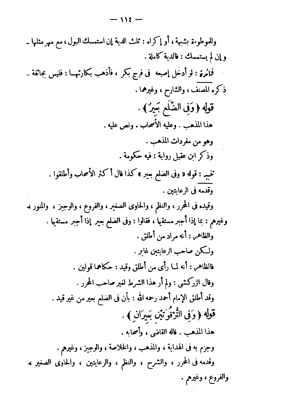 تَنْبِيهٌ: قَوْلُهُ " وَفِي الضِّلَعِ بَعِيرٌ " كَذَا قَالَ أَكْثَرُ الْأَصْحَابِ وَأَطْلَقُوا، وَقَدَّمَهُ فِي الرِّعَايَتَيْنِ. وَقَيَّدَهُ فِي الْمُحَرَّرِ، وَالنَّظْمِ، وَالْحَاوِي الصَّغِيرِ، وَالْفُرُوعِ، وَالْوَجِيزِ، وَالْمُنَوِّرِ، وَغَيْرِهِمْ: بِمَا إذَا أُجْبِرَ مُسْتَقِيمًا، فَقَالُوا: وَفِي الضِّلْعِ بَعِيرٌ إذَا أُجْبِرَ مُسْتَقِيمًا. وَالظَّاهِرُ: أَنَّهُ مُرَادُ مَنْ أَطْلَقَ. وَلَكِنَّ صَاحِبَ الرِّعَايَتَيْنِ غَايَرَ، فَالظَّاهِرُ: أَنَّهُ لَمَّا رَأَى مَنْ أَطْلَقَ وَقَيَّدَ حَكَاهُمَا قَوْلَيْنِ. وَقَالَ الزَّرْكَشِيُّ: وَلَمْ أَرَ هَذَا الشَّرْطَ لِغَيْرِ صَاحِبِ الْمُحَرَّرِ. وَقَدْ أَطْلَقَ الْإِمَامُ أَحْمَدُ - رَحِمَهُ اللَّهُ - بِأَنَّ فِي الضِّلَعِ بَعِيرًا مِنْ غَيْرِ قَيْدٍ. قَوْلُهُ (وَفِي التَّرْقُوَتَيْنِ بَعِيرَانِ) . هَذَا الْمَذْهَبُ.
