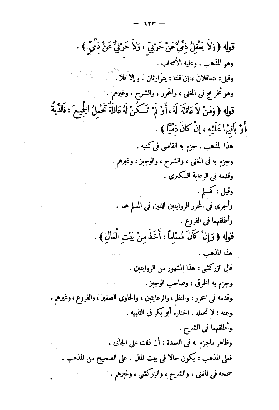 قَوْلُهُ (وَلَا يَعْقِلُ ذِمِّيٌّ عَنْ حَرْبِيٍّ، وَلَا حَرْبِيٌّ عَنْ ذِمِّيٍّ) . وَهُوَ الْمَذْهَبُ. وَعَلَيْهِ الْأَصْحَابُ. وَقِيلَ: يَتَعَاقَلَانِ، إنْ قُلْنَا: يَتَوَارَثَانِ. وَإِلَّا فَلَا. وَهُوَ تَخْرِيجٌ فِي الْمُغْنِي، وَالْمُحَرَّرِ، وَالشَّرْحِ، وَغَيْرِهِمْ. قَوْلُهُ (وَمَنْ لَا عَاقِلَةَ لَهُ، أَوْ لَمْ تَكُنْ لَهُ عَاقِلَةٌ تَحْمِلُ الْجَمِيعَ: فَالدِّيَةُ أَوْ بَاقِيهَا عَلَيْهِ، إنْ كَانَ ذِمِّيًّا) . هَذَا الْمَذْهَبُ، جَزَمَ بِهِ الْقَاضِي فِي كُتُبِهِ. وَجَزَمَ بِهِ فِي الْمُغْنِي، وَالشَّرْحِ، وَالْوَجِيزِ، وَغَيْرِهِمْ، وَقَدَّمَهُ فِي الرِّعَايَةِ الْكُبْرَى. وَقِيلَ: كَمُسْلِمٍ. وَأَجْرَى فِي الْمُحَرَّرِ الرِّوَايَتَيْنِ اللَّتَيْنِ فِي الْمُسْلِمِ هُنَا. وَأَطْلَقَهُمَا فِي الْفُرُوعِ. قَوْلُهُ (وَإِنْ كَانَ مُسْلِمًا أَخَذَ مِنْ بَيْتِ الْمَالِ) . هَذَا الْمَذْهَبُ. قَالَ الزَّرْكَشِيُّ: هَذَا الْمَشْهُورُ مِنْ الرِّوَايَتَيْنِ، وَجَزَمَ بِهِ الْخِرَقِيُّ، وَصَاحِبُ الْوَجِيزِ. وَقَدَّمَهُ فِي الْمُحَرَّرِ، وَالنَّظْمِ، وَالرِّعَايَتَيْنِ، وَالْحَاوِي الصَّغِيرِ، وَالْفُرُوعِ، وَغَيْرِهِمْ.
