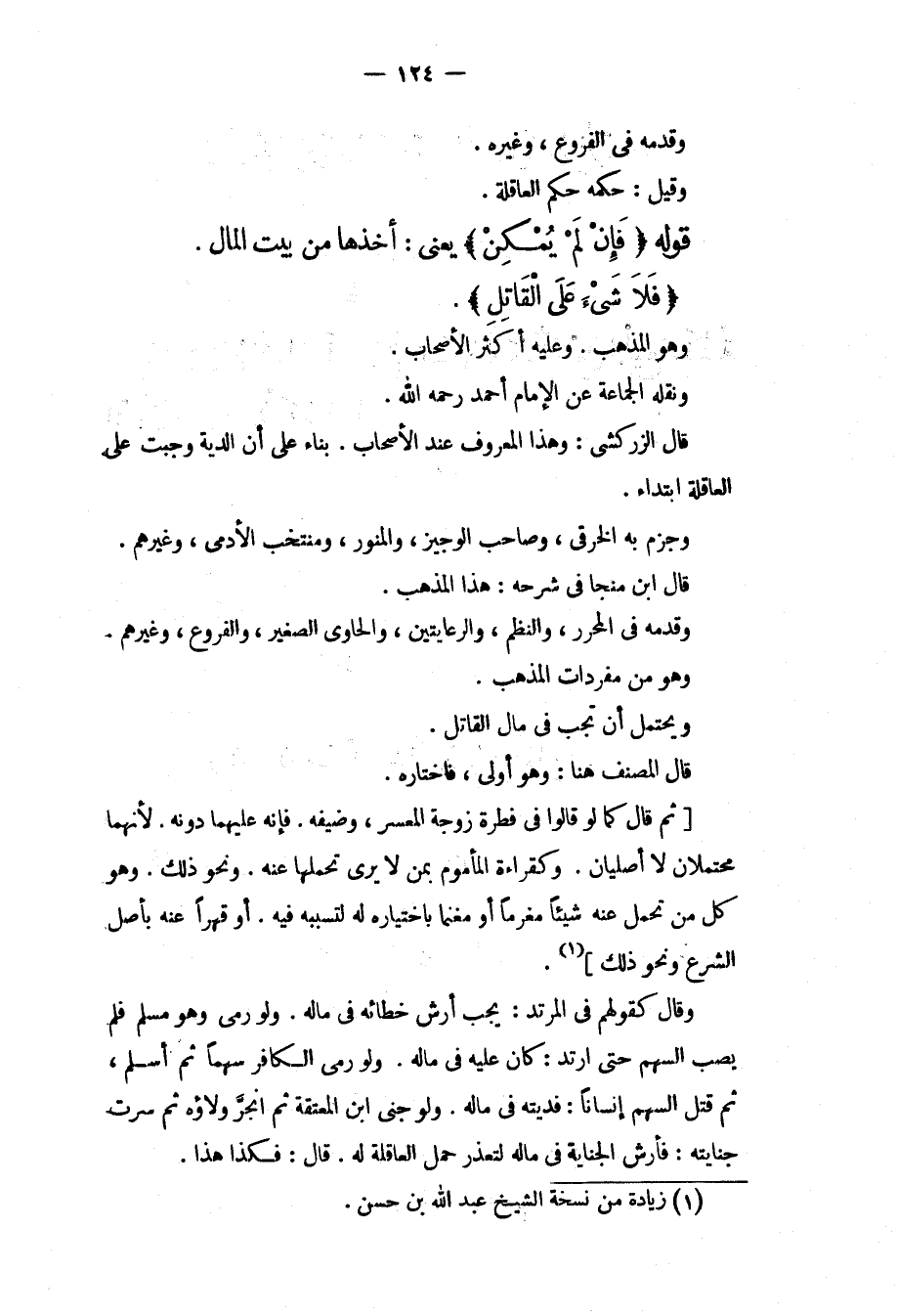 وَقَدَّمَهُ فِي الْفُرُوعِ، وَغَيْرِهِ. وَقِيلَ: حُكْمُهُ حُكْمُ الْعَاقِلَةِ. قَوْلُهُ (فَإِنْ لَمْ يُمْكِنْ) يَعْنِي: أَخْذُهَا مِنْ بَيْتِ الْمَالِ. (فَلَا شَيْءَ عَلَى الْقَاتِلِ) . وَهُوَ الْمَذْهَبُ. وَعَلَيْهِ أَكْثَرُ الْأَصْحَابِ. وَنَقَلَهُ الْجَمَاعَةُ عَنْ الْإِمَامِ أَحْمَدَ - رَحِمَهُ اللَّهُ -. قَالَ الزَّرْكَشِيُّ: وَهَذَا الْمَعْرُوفُ عِنْدَ الْأَصْحَابِ. بِنَاءً عَلَى أَنَّ الدِّيَةَ وَجَبَتْ عَلَى الْعَاقِلَةِ ابْتِدَاءً، وَجَزَمَ بِهِ الْخِرَقِيُّ، وَصَاحِبُ الْوَجِيزِ، وَالْمُنَوِّرِ، وَمُنْتَخَبِ الْأَدَمِيِّ، وَغَيْرُهُمْ. قَالَ ابْنُ مُنَجَّا فِي شَرْحِهِ: هَذَا الْمَذْهَبُ، وَقَدَّمَهُ فِي الْمُحَرَّرِ، وَالنَّظْمِ، وَالرِّعَايَتَيْنِ، وَالْحَاوِي الصَّغِيرِ، وَالْفُرُوعِ، وَغَيْرِهِمْ. وَهُوَ مِنْ مُفْرَدَاتِ الْمَذْهَبِ. وَيُحْتَمَلُ أَنْ تَجِبَ فِي مَالِ الْقَاتِلِ.