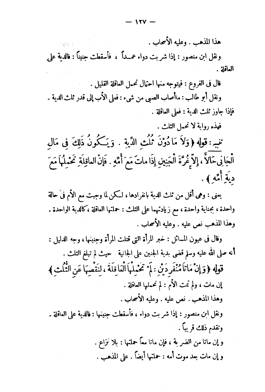هَذَا الْمَذْهَبُ. وَعَلَيْهِ الْأَصْحَابُ. وَنَقَلَ ابْنُ مَنْصُورٍ: إذَا شَرِبَتْ دَوَاءً عَمْدًا، فَأَسْقَطَتْ جَنِينًا: فَالدِّيَةُ عَلَى الْعَاقِلَةِ. قَالَ فِي الْفُرُوعِ: فَيَتَوَجَّهُ مِنْهَا احْتِمَالُ تَحَمُّلِ الْعَاقِلَةِ الْقَلِيلَ. وَنَقَلَ أَبُو طَالِبٍ: مَا أَصَابَ الصَّبِيَّ مِنْ شَيْءٍ: فَعَلَى الْأَبِ إلَى قَدْرِ ثُلُثِ الدِّيَةِ. فَإِذَا جَاوَزَ ثُلُثَ الدِّيَةِ: فَعَلَى الْعَاقِلَةِ. فَهَذِهِ رِوَايَةٌ لَا تَحْمِلُ الثُّلُثَ.