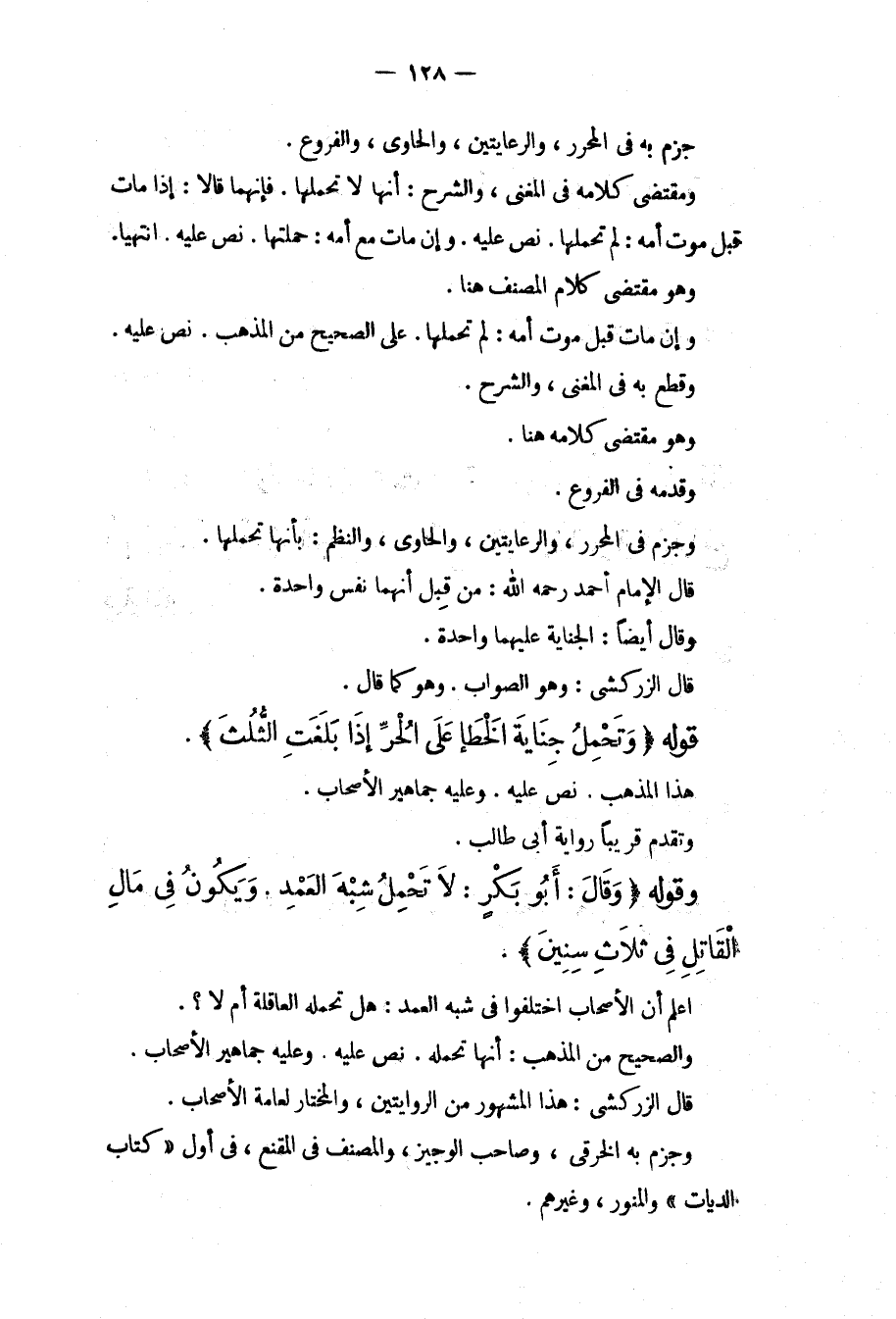 قَوْلُهُ (وَتَحْمِلُ جِنَايَةَ الْخَطَإِ عَلَى الْحُرِّ إذَا بَلَغَتْ الثُّلُثَ) . هَذَا الْمَذْهَبُ، نَصَّ عَلَيْهِ. وَعَلَيْهِ جَمَاهِيرُ الْأَصْحَابِ. وَتَقَدَّمَ قَرِيبًا رِوَايَةُ أَبِي طَالِبٍ. وَقَوْلُهُ (وَقَالَ: أَبُو بَكْرٍ: لَا تَحْمِلُ شِبْهَ الْعَمْدِ. وَيَكُونُ فِي مَالِ الْقَاتِلِ فِي ثَلَاثِ سِنِينَ) . اعْلَمْ أَنَّ الْأَصْحَابَ اخْتَلَفُوا فِي شِبْهِ الْعَمْدِ: هَلْ تَحْمِلُهُ الْعَاقِلَةُ أَمْ لَا، وَالصَّحِيحُ مِنْ الْمَذْهَبِ: أَنَّهَا تَحْمِلُهُ، نَصَّ عَلَيْهِ. وَعَلَيْهِ جَمَاهِيرُ الْأَصْحَابِ. قَالَ الزَّرْكَشِيُّ: هَذَا الْمَشْهُورُ مِنْ الرِّوَايَتَيْنِ، وَالْمُخْتَارُ لِعَامَّةِ الْأَصْحَابِ، وَجَزَمَ بِهِ الْخِرَقِيُّ، وَصَاحِبُ الْوَجِيزِ، وَالْمُصَنِّفُ فِي الْمُقْنِعِ، فِي أَوَّلِ " كِتَابِ الدِّيَاتِ " وَالْمُنَوِّرِ، وَغَيْرُهُمْ.