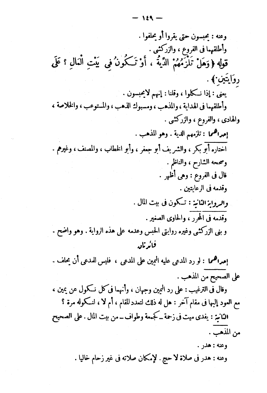 وَالرِّوَايَةُ الثَّانِيَةُ: تَكُونُ فِي بَيْتِ الْمَالِ، وَقَدَّمَهُ فِي الْمُحَرَّرِ، وَالْحَاوِي الصَّغِيرِ. وَبَنَى الزَّرْكَشِيُّ وَغَيْرُهُ رِوَايَتَيْ الْحَبْسِ وَعَدَمِهِ عَلَى هَذِهِ الرِّوَايَةِ. وَهُوَ وَاضِحٌ. فَائِدَتَانِ إحْدَاهُمَا: لَوْ رَدَّ الْمُدَّعَى عَلَيْهِ الْيَمِينَ عَلَى الْمُدَّعِي، فَلَيْسَ لِلْمُدَّعِي أَنْ يَحْلِفَ عَلَى الصَّحِيحِ مِنْ الْمَذْهَبِ. وَقَالَ فِي التَّرْغِيبِ: عَلَى رَدِّ الْيَمِينِ وَجْهَانِ، وَأَنَّهُمَا فِي كُلٍّ نُكُولٌ عَنْ يَمِينٍ مَعَ الْعَوْدِ إلَيْهَا فِي مَقَامٍ آخَرَ: هَلْ لَهُ ذَلِكَ لِتَعَدُّدِ الْمَقَامِ، أَمْ لَا، لِنُكُولِهِ مَرَّةً؟ الثَّانِيَةُ: يُفْدَى مَيِّتٌ فِي زَحْمَةٍ كَجُمُعَةٍ وَطَوَافٍ مِنْ بَيْتِ الْمَالِ عَلَى الصَّحِيحِ مِنْ الْمَذْهَبِ. وَعَنْهُ: هَدَرٌ. وَعَنْهُ: هَدَرٌ فِي صَلَاةٍ لَا حَجٍّ لِإِمْكَانِ صَلَاتِهِ فِي غَيْرِ زِحَامٍ خَالِيًا.