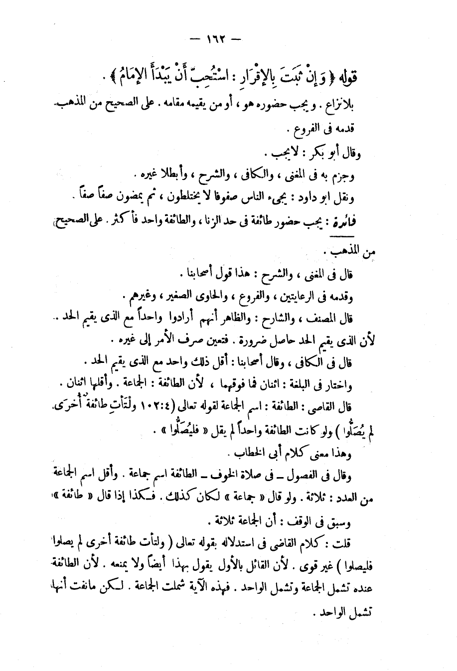 فَائِدَةٌ: يَجِبُ حُضُورُ طَائِفَةٍ فِي حَدِّ الزِّنَا، وَالطَّائِفَةُ وَاحِدٌ فَأَكْثَرُ عَلَى الصَّحِيحِ مِنْ الْمَذْهَبِ. قَالَ فِي الْمُغْنِي، وَالشَّرْحِ: هَذَا قَوْلُ أَصْحَابِنَا، وَقَدَّمَهُ فِي الرِّعَايَتَيْنِ، وَالْفُرُوعِ، وَالْحَاوِي الصَّغِيرِ، وَغَيْرِهِمْ. قَالَ الْمُصَنِّفُ، وَالشَّارِحُ: وَالظَّاهِرُ أَنَّهُمْ أَرَادُوا وَاحِدًا مَعَ الَّذِي يُقِيمُ الْحَدَّ؛ لِأَنَّ الَّذِي يُقِيمُ الْحَدَّ حَاصِلٌ ضَرُورَةً. فَتَعَيَّنَ صَرْفُ الْأَمْرِ إلَى غَيْرِهِ. قَالَ فِي الْكَافِي، وَقَالَ أَصْحَابُنَا: أَقَلُّ ذَلِكَ وَاحِدٌ مَعَ الَّذِي يُقِيمُ الْحَدَّ، وَاخْتَارَ فِي الْبُلْغَةِ: اثْنَانِ فَمَا فَوْقَهُمَا؛ لِأَنَّ الطَّائِفَةَ: الْجَمَاعَةُ. وَأَقَلُّهَا اثْنَانِ. قَالَ الْقَاضِي: الطَّائِفَةُ: اسْمُ الْجَمَاعَةِ {وَلْتَأْتِ طَائِفَةٌ أُخْرَى لَمْ يُصَلُّوا} [النساء: 102] وَلَوْ كَانَتْ الطَّائِفَةُ وَاحِدًا لَمْ يَقُلْ {فَلْيُصَلُّوا} [النساء: 102] . وَهَذَا مَعْنَى كَلَامِ أَبِي الْخَطَّابِ. وَقَالَ فِي الْفُصُولِ فِي صَلَاةِ الْخَوْفِ الطَّائِفَةُ اسْمُ جَمَاعَةٍ. وَأَقَلُّ اسْمِ الْجَمَاعَةِ مِنْ الْعَدَدِ: ثَلَاثَةٌ. وَلَوْ قَالَ " جَمَاعَةٍ " لَكَانَ كَذَلِكَ. فَكَذَا إذَا قَالَ " طَائِفَةٍ " وَسَبَقَ فِي الْوَقْفِ: أَنَّ الْجَمَاعَةَ ثَلَاثَةٌ. قُلْت: كَلَامُ الْقَاضِي فِي اسْتِدْلَالِهِ بِقَوْلِهِ تَعَالَى {وَلْتَأْتِ طَائِفَةٌ أُخْرَى لَمْ يُصَلُّوا فَلْيُصَلُّوا} [النساء: 102] غَيْرُ قَوِيٍّ؛ لِأَنَّ الْقَائِلَ بِالْأَوَّلِ يَقُولُ بِهَذَا أَيْضًا وَلَا يَمْنَعُهُ؛ لِأَنَّ الطَّائِفَةَ عِنْدَهُ تَشْمَلُ الْجَمَاعَةَ وَتَشْمَلُ الْوَاحِدَ. فَهَذِهِ الْآيَةُ شَمِلَتْ الْجَمَاعَةَ. لَكِنْ مَا نَفَتْ أَنَّهَا تَشْمَلُ الْوَاحِدَ.