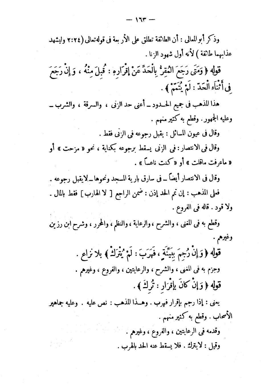 قَوْلُهُ (وَمَتَى رَجَعَ الْمُقِرُّ بِالْحَدِّ عَنْ إقْرَارِهِ: قُبِلَ مِنْهُ، وَإِنْ رَجَعَ فِي أَثْنَاءِ الْحَدِّ: لَمْ يُتْمَمْ) . هَذَا الْمَذْهَبُ فِي جَمِيعِ الْحُدُودِ أَعْنِي حَدَّ الزِّنَا، وَالسَّرِقَةِ، وَالشُّرْبِ وَعَلَيْهِ الْجُمْهُورُ، وَقَطَعَ بِهِ كَثِيرٌ مِنْهُمْ. وَقَالَ فِي عُيُونِ الْمَسَائِلِ: يُقْبَلُ رُجُوعُهُ فِي الزِّنَا فَقَطْ. وَقَالَ فِي الِانْتِصَارِ: فِي الزِّنَا يَسْقُطُ بِرُجُوعِهِ بِكِنَايَةٍ، نَحْوِ " مَزَحْت " أَوْ " مَا عَرَفْت مَا قُلْت " أَوْ " كُنْت نَاعِسًا ". وَقَالَ فِي الِانْتِصَارِ أَيْضًا فِي سَارِقِ بَارِيَّةِ الْمَسْجِدِ وَنَحْوِهَا لَا يُقْبَلُ رُجُوعُهُ. فَعَلَى الْمَذْهَبِ: إنْ تُمِّمَ الْحَدُّ إذَنْ: ضَمِنَ الرَّاجِعُ [لَا الْهَارِبُ] فَقَطْ الْمَالَ. وَلَا قَوَدَ. قَالَهُ فِي الْفُرُوعِ، وَقَطَعَ بِهِ فِي الْمُغْنِي، وَالشَّرْحِ، وَالرِّعَايَةِ، وَالنَّظْمِ، وَالْمُحَرَّرِ، وَشَرْحِ ابْنِ رَزِينٍ وَغَيْرِهِمْ.