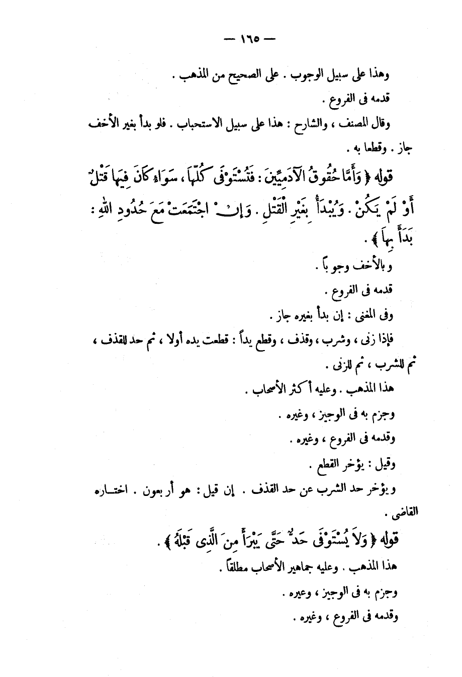 قَوْلُهُ (وَأَمَّا حُقُوقُ الْآدَمِيِّينَ: فَتُسْتَوْفَى كُلُّهَا، سَوَاءٌ كَانَ فِيهَا قَتْلٌ أَوْ لَمْ يَكُنْ. وَيُبْدَأُ بِغَيْرِ الْقَتْلِ. وَإِنْ اجْتَمَعَتْ مَعَ حُدُودِ اللَّهِ: بُدِئَ بِهَا) . وَبِالْأَخَفِّ وُجُوبًا، قَدَّمَهُ فِي الْفُرُوعِ. وَفِي الْمُغْنِي: إنْ بُدِئَ بِغَيْرِهِ جَازَ. فَإِذَا زَنَى، وَشَرِبَ، وَقَذَفَ، وَقَطَعَ يَدًا: قُطِعَتْ يَدُهُ أَوَّلًا، ثُمَّ حُدَّ لِلْقَذْفِ، ثُمَّ لِلشُّرْبِ، ثُمَّ لِلزِّنَا. هَذَا الْمَذْهَبُ. وَعَلَيْهِ أَكْثَرُ الْأَصْحَابِ، وَجَزَمَ بِهِ فِي الْوَجِيزِ، وَغَيْرِهِ، وَقَدَّمَهُ فِي الْفُرُوعِ، وَغَيْرِهِ. وَقِيلَ: يُؤَخَّرُ الْقَطْعُ. وَيُؤَخَّرُ حَدُّ الشُّرْبِ عَنْ حَدِّ الْقَذْفِ إنْ قِيلَ: هُوَ أَرْبَعُونَ. اخْتَارَهُ الْقَاضِي. قَوْلُهُ (وَلَا يُسْتَوْفَى حَدٌّ حَتَّى يَبْرَأَ مِنْ الَّذِي قَبْلَهُ) . هَذَا الْمَذْهَبُ. وَعَلَيْهِ جَمَاهِيرُ الْأَصْحَابِ مُطْلَقًا، وَجَزَمَ بِهِ فِي الْوَجِيزِ، وَغَيْرِهِ، وَقَدَّمَهُ فِي الْفُرُوعِ، وَغَيْرِهِ.