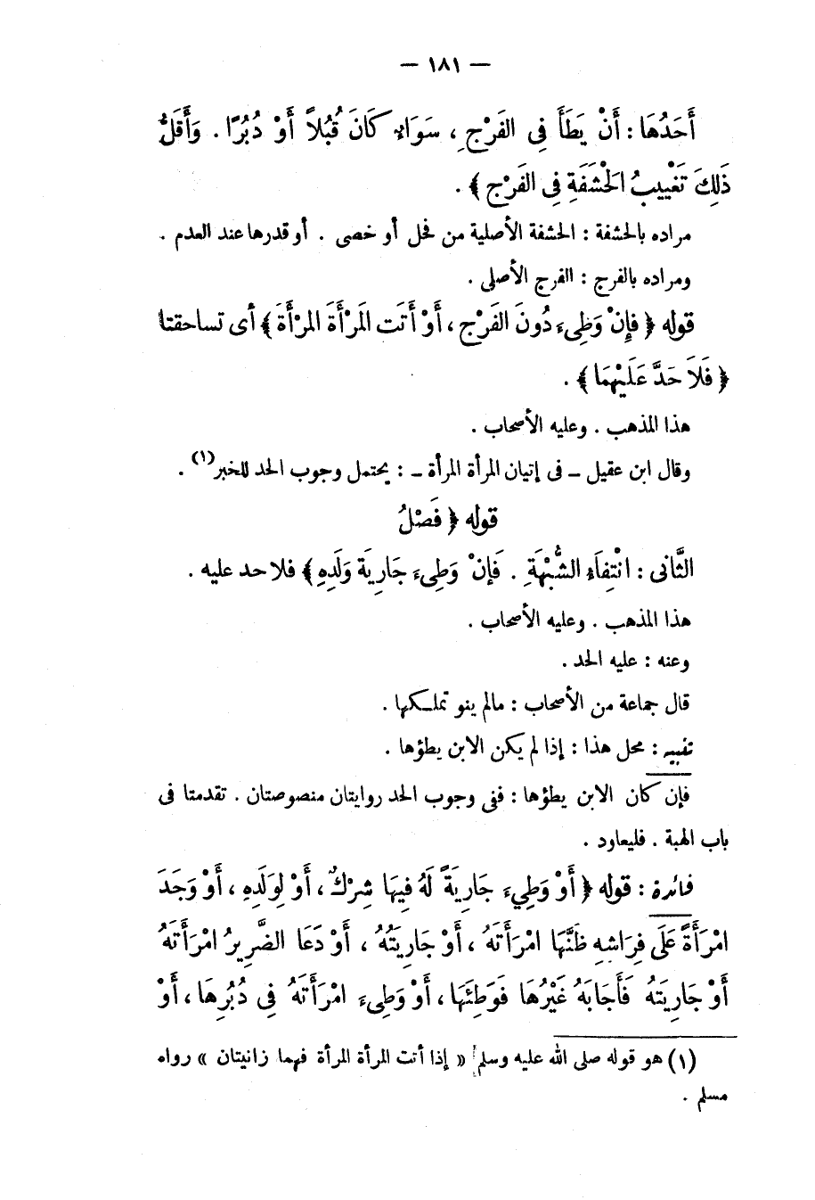 أَحَدُهَا: أَنْ يَطَأَ فِي الْفَرَجِ، سَوَاءٌ كَانَ قُبُلًا أَوْ دُبُرًا. وَأَقَلُّ ذَلِكَ تَغْيِيبُ الْحَشَفَةِ فِي الْفَرَجِ) . مُرَادُهُ بِالْحَشَفَةِ: الْحَشَفَةُ الْأَصْلِيَّةُ مِنْ فَحْلٍ أَوْ خَصِيٍّ. أَوْ قَدْرِهَا عِنْدَ الْعَدَمِ. وَمُرَادُهُ بِالْفَرْجِ: الْفَرَجُ الْأَصْلِيُّ.