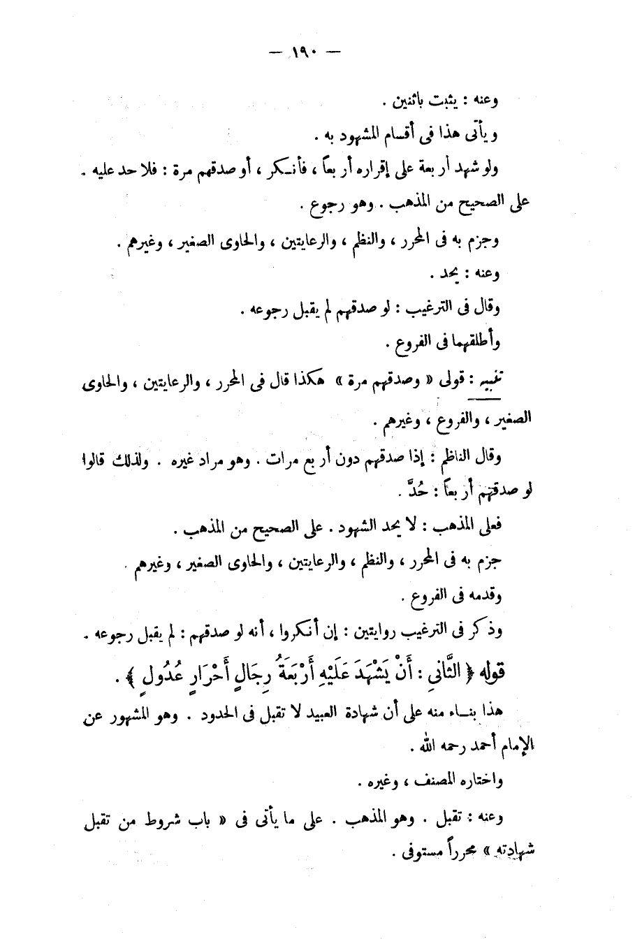 قَوْلُهُ (الثَّانِي: أَنْ يَشْهَدَ عَلَيْهِ أَرْبَعَةُ رِجَالٍ أَحْرَارٍ عُدُولٍ) . هَذَا بِنَاءٌ مِنْهُ عَلَى أَنَّ شَهَادَةَ الْعَبِيدِ لَا تُقْبَلُ فِي الْحُدُودِ. وَهُوَ الْمَشْهُورُ عَنْ الْإِمَامِ أَحْمَدَ - رَحِمَهُ اللَّهُ -. وَاخْتَارَهُ الْمُصَنِّفُ، وَغَيْرُهُ. وَعَنْهُ: تُقْبَلُ. وَهُوَ الْمَذْهَبُ. عَلَى مَا يَأْتِي فِي " بَابِ شُرُوطِ مَنْ تُقْبَلُ شَهَادَتُهُ " مُحَرَّرًا مُسْتَوْفًى.