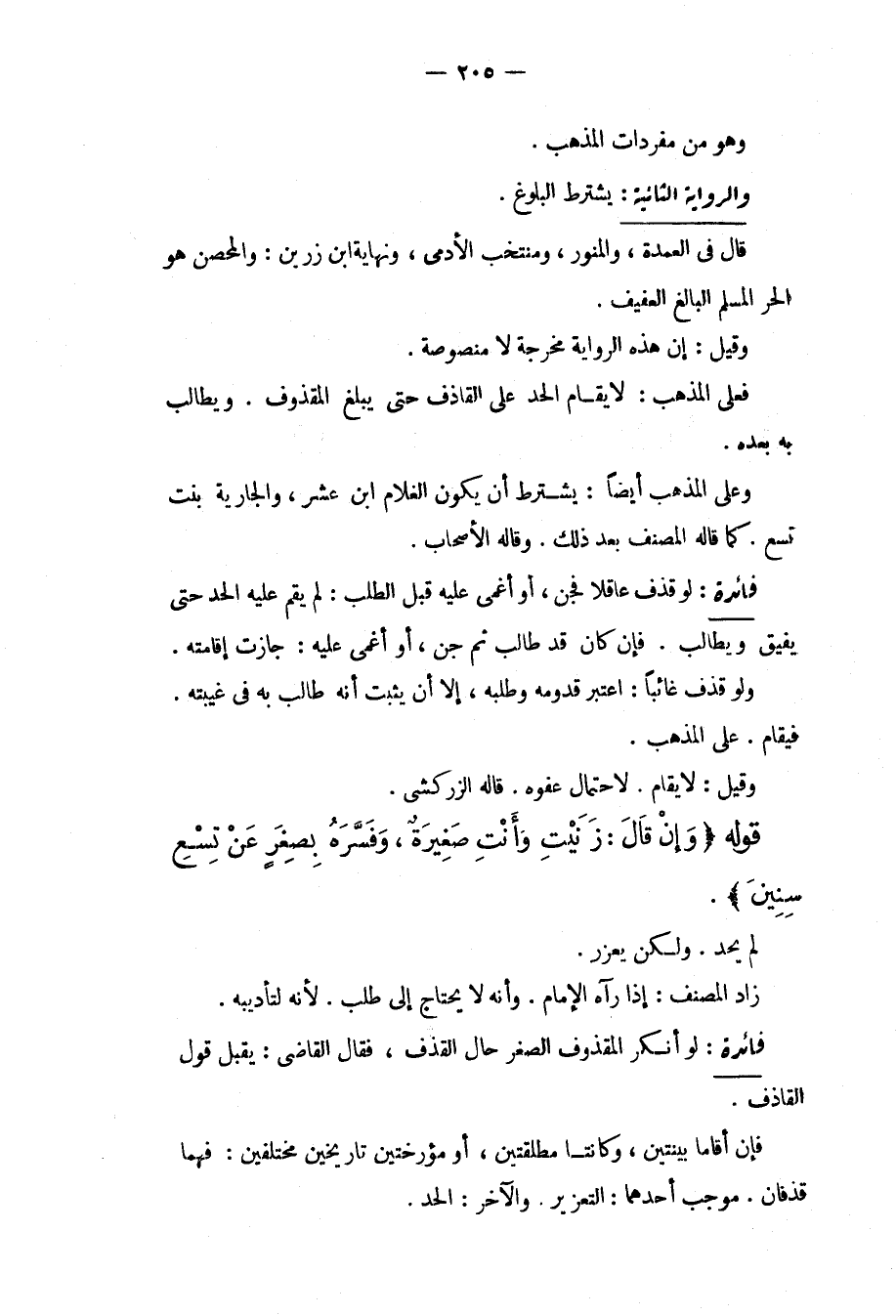 وَهُوَ مِنْ مُفْرَدَاتِ الْمَذْهَبِ، وَالرِّوَايَةُ الثَّانِيَةُ: يُشْتَرَطُ الْبُلُوغُ. قَالَ فِي الْعُمْدَةِ، وَالْمُنَوِّرِ، وَمُنْتَخَبِ الْأَدَمِيِّ، وَنِهَايَةِ ابْنِ رَزِينٍ: وَالْمُحْصَنُ هُوَ الْحُرُّ الْمُسْلِمُ الْبَالِغُ الْعَفِيفُ. وَقِيلَ: إنَّ هَذِهِ الرِّوَايَةَ مُخَرَّجَةٌ لَا مَنْصُوصَةٌ. فَعَلَى الْمَذْهَبِ: لَا يُقَامُ الْحَدُّ عَلَى الْقَاذِفِ حَتَّى يَبْلُغَ الْمَقْذُوفُ وَيُطَالِبَ بِهِ بَعْدَهُ. وَعَلَى الْمَذْهَبِ أَيْضًا: يُشْتَرَطُ أَنْ يَكُونَ الْغُلَامُ ابْنَ عَشْرٍ، وَالْجَارِيَةُ بِنْتَ تِسْعٍ. كَمَا قَالَهُ الْمُصَنِّفُ بَعْدَ ذَلِكَ. وَقَالَهُ الْأَصْحَابُ.