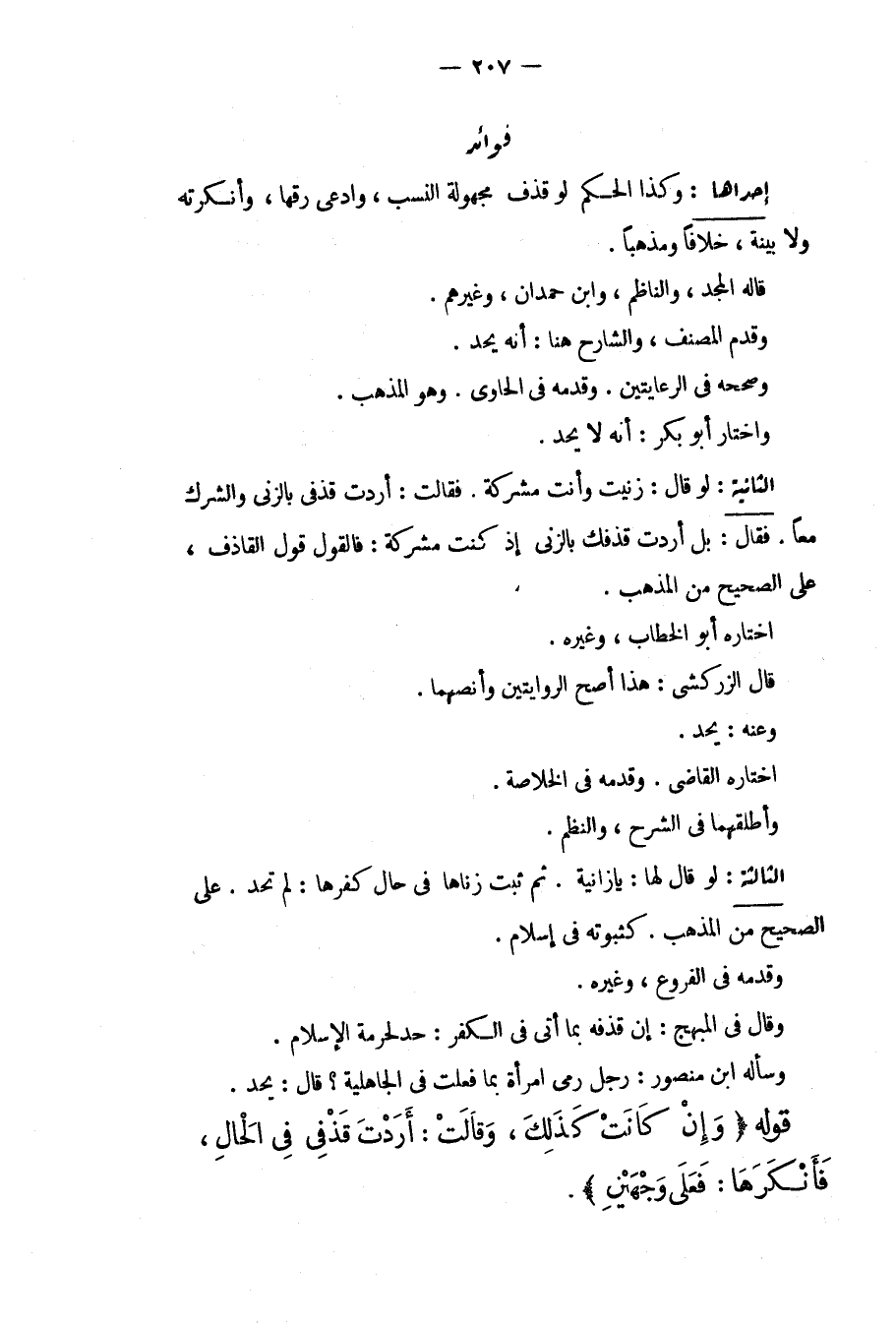 الثَّانِيَةُ: لَوْ قَالَ: زَنَيْت وَأَنْتِ مُشْرِكَةٌ. فَقَالَتْ: أَرَدْت قَذْفِي بِالزِّنَا وَالشِّرْكِ مَعًا. فَقَالَ: بَلْ أَرَدْت قَذْفَك بِالزِّنَا إذْ كُنْت مُشْرِكَةً: فَالْقَوْلُ قَوْلُ الْقَاذِفِ، عَلَى الصَّحِيحِ مِنْ الْمَذْهَبِ، اخْتَارَهُ أَبُو الْخَطَّابِ، وَغَيْرُهُ. قَالَ الزَّرْكَشِيُّ: هَذَا أَصَحُّ الرِّوَايَتَيْنِ وَأَنَصُّهُمَا. وَعَنْهُ: يُحَدُّ، اخْتَارَهُ الْقَاضِي، وَقَدَّمَهُ فِي الْخُلَاصَةِ. وَأَطْلَقَهُمَا فِي الشَّرْحِ، وَالنَّظْمِ الثَّالِثَةُ: لَوْ قَالَ لَهَا: يَا زَانِيَةُ. ثُمَّ ثَبَتَ زِنَاهَا فِي حَالِ كُفْرِهَا: لَمْ تُحَدَّ عَلَى الصَّحِيحِ مِنْ الْمَذْهَبِ. كَثُبُوتِهِ فِي إسْلَامٍ، وَقَدَّمَهُ فِي الْفُرُوعِ، وَغَيْرِهِ. وَقَالَ فِي الْمُبْهِجِ: إنْ قَذَفَهُ بِمَا أَتَى فِي الْكُفْرِ: حُدَّ لِحُرْمَةِ الْإِسْلَامِ. وَسَأَلَهُ ابْنُ مَنْصُورٍ: رَجُلٌ رَمَى امْرَأَةً بِمَا فَعَلَتْ فِي الْجَاهِلِيَّةِ؟ قَالَ: يُحَدُّ. قَوْلُهُ (وَإِنْ كَانَتْ كَذَلِكَ، وَقَالَتْ: أَرَدْتَ قَذْفِي فِي الْحَالِ، فَأَنْكَرَهَا: فَعَلَى وَجْهَيْنِ) .