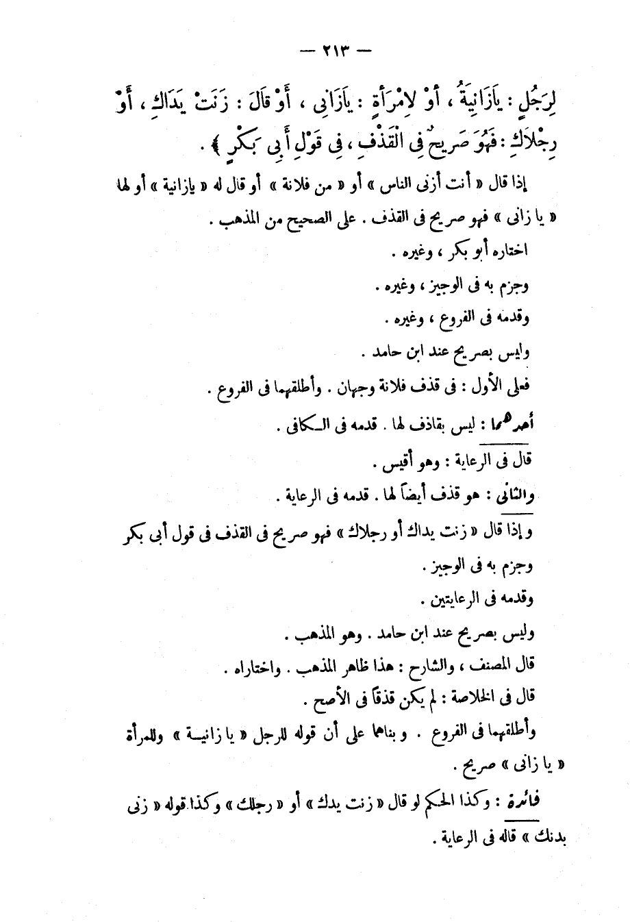 أَحَدُهُمَا: لَيْسَ بِقَاذِفٍ لَهَا، قَدَّمَهُ فِي الْكَافِي. قَالَ فِي الرِّعَايَةِ: وَهُوَ أَقْيَسُ. وَالثَّانِي: هُوَ قَذْفٌ أَيْضًا لَهَا، قَدَّمَهُ فِي الرِّعَايَةِ. وَإِذَا قَالَ " زَنَتْ يَدَاك أَوْ رِجْلَاك " فَهُوَ صَرِيحٌ فِي الْقَذْفِ فِي قَوْلِ أَبِي بَكْرٍ وَجَزَمَ بِهِ فِي الْوَجِيزِ، وَقَدَّمَهُ فِي الرِّعَايَتَيْنِ. وَلَيْسَ بِصَرِيحٍ عِنْدَ ابْنِ حَامِدٍ. وَهُوَ الْمَذْهَبُ. قَالَ الْمُصَنِّفُ، وَالشَّارِحُ: هَذَا ظَاهِرُ الْمَذْهَبِ، وَاخْتَارَاهُ. قَالَ فِي الْخُلَاصَةِ: لَمْ يَكُنْ قَذْفًا فِي الْأَصَحِّ. وَأَطْلَقَهُمَا فِي الْفُرُوعِ. وَبَنَاهُمَا عَلَى أَنَّ قَوْلَهُ لِلرَّجُلِ " يَا زَانِيَةُ " وَلِلْمَرْأَةِ " يَا زَانِي " صَرِيحٌ. فَائِدَةٌ: وَكَذَا الْحَكَمُ لَوْ قَالَ " زَنَتْ يَدُك " أَوْ " رِجْلُك " وَكَذَا قَوْلُهُ " زَنَى بَدَنُك " قَالَهُ فِي الرِّعَايَةِ.