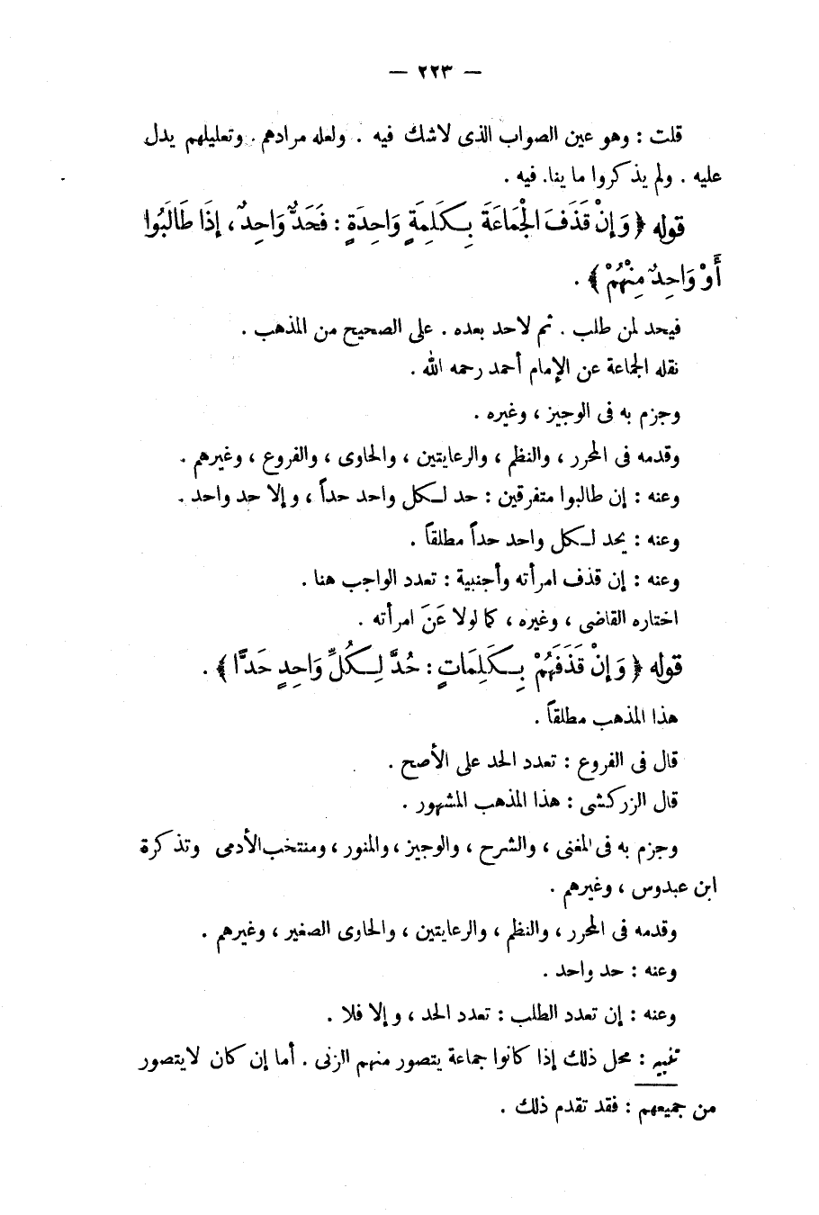 قَوْلُهُ (وَإِنْ قَذَفَهُمْ بِكَلِمَاتٍ: حُدَّ لِكُلِّ وَاحِدٍ حَدًّا) . هَذَا الْمَذْهَبُ مُطْلَقًا. قَالَ فِي الْفُرُوعِ: تَعَدَّدَ الْحَدُّ عَلَى الْأَصَحِّ. قَالَ الزَّرْكَشِيُّ: هَذَا الْمَذْهَبُ الْمَشْهُورُ، وَجَزَمَ بِهِ فِي الْمُغْنِي، وَالشَّرْحِ، وَالْوَجِيزِ، وَالْمُنَوِّرِ، وَمُنْتَخَبِ الْأَدَمِيِّ وَتَذْكِرَةِ ابْنِ عَبْدُوسٍ، وَغَيْرِهِمْ، وَقَدَّمَهُ فِي الْمُحَرَّرِ، وَالنَّظْمِ، وَالرِّعَايَتَيْنِ، وَالْحَاوِي الصَّغِيرِ، وَغَيْرِهِمْ. وَعَنْهُ: حَدٌّ وَاحِدٌ. وَعَنْهُ: إنْ تَعَدَّدَ الطَّلَبُ: تَعَدَّدَ الْحَدُّ، وَإِلَّا فَلَا.