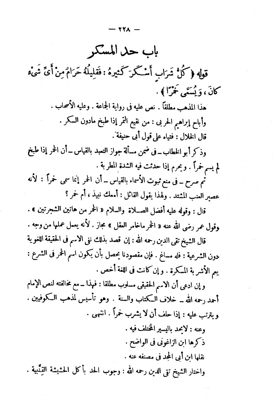 ِ قَوْلُهُ (كُلُّ شَرَابٍ أَسْكَرَ كَثِيرُهُ فَقَلِيلُهُ حَرَامٌ مِنْ أَيِّ شَيْءٍ كَانَ، وَيُسَمَّى خَمْرًا) . هَذَا الْمَذْهَبُ مُطْلَقًا. نَصَّ عَلَيْهِ فِي رِوَايَةِ الْجَمَاعَةِ. وَعَلَيْهِ الْأَصْحَابُ. وَأَبَاحَ إبْرَاهِيمُ الْحَرْبِيُّ: مِنْ نَقِيعِ التَّمْرِ إذَا طُبِخَ مَا دُونَ السُّكْرِ. قَالَ الْخَلَّالُ: فُتْيَاهُ عَلَى قَوْلِ أَبِي حَنِيفَةَ. وَذَكَرَ أَبُو الْخَطَّابِ فِي ضِمْنِ مَسْأَلَةِ جَوَازِ التَّعَبُّدِ بِالْقِيَاسِ أَنَّ الْخَمْرَ إذَا طُبِخَ لَمْ يُسَمَّ خَمْرًا. وَيَحْرُمُ إذَا حَدَثَتْ فِيهِ الشِّدَّةُ الْمُطْرِبَةُ. ثُمَّ صَرَّحَ فِي مَنْعِ ثُبُوتِ الْأَسْمَاءِ بِالْقِيَاسِ أَنَّ الْخَمْرَ إنَّمَا سُمِّيَ خَمْرًا؛ لِأَنَّهُ عَصِيرُ الْعِنَبِ الْمُشْتَدِّ. وَلِهَذَا يَقُولُ الْقَائِلُ: أَمَعَك نَبِيذٌ، أَمْ خَمْرٌ؟ قَالَ: وَقَوْلُهُ عَلَيْهِ أَفْضَلُ الصَّلَاةِ وَالسَّلَامِ «الْخَمْرُ مِنْ هَاتَيْنِ الشَّجَرَتَيْنِ.» وَقَوْلُ عُمَرَ - رَضِيَ اللَّهُ عَنْهُ - " الْخَمْرُ مَا خَامَرَ الْعَقْلَ " مَجَازٌ؛ لِأَنَّهُ يَعْمَلُ عَمَلَهَا مِنْ وَجْهٍ. قَالَ الشَّيْخُ تَقِيُّ الدِّينِ - رَحِمَهُ اللَّهُ -: إنْ قَصَدَ بِذَلِكَ نَفْيَ الِاسْمِ فِي الْحَقِيقَةِ اللُّغَوِيَّةِ دُونَ الشَّرْعِيَّةِ: فَلَهُ مَسَاغٌ. فَإِنَّ مَقْصُودَنَا يَحْصُلُ بِأَنْ يَكُونَ اسْمُ الْخَمْرِ فِي الشَّرْعِ يَعُمُّ الْأَشْرِبَةَ الْمُسْكِرَةَ. وَإِنْ كَانَتْ فِي اللُّغَةِ أَخَصَّ. وَإِنْ ادَّعَى أَنَّ الِاسْمَ الْحَقِيقِيَّ مَسْلُوبٌ مُطْلَقًا: فَهَذَا مَعَ مُخَالَفَتِهِ لِنَصِّ الْإِمَامِ أَحْمَدَ - رَحِمَهُ اللَّهُ - خِلَافُ الْكِتَابِ وَالسُّنَّةِ. وَهُوَ تَأْسِيسٌ لِمَذْهَبِ الْكُوفِيِّينَ. وَيَتَرَتَّبُ عَلَيْهِ: إذَا حَلَفَ أَنْ لَا يَشْرَبَ خَمْرًا. انْتَهَى.