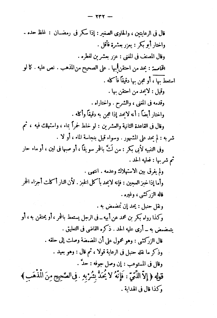 قَالَ فِي الرِّعَايَتَيْنِ، وَالْحَاوِي الصَّغِيرِ: إذَا سَكِرَ فِي رَمَضَانَ: غُلِّظَ حَدُّهُ، وَاخْتَارَ أَبُو بَكْرٍ: يُعَزَّرُ بِعَشْرَةٍ فَأَقَلَّ. وَقَالَ الْمُصَنِّفُ فِي الْمُغْنِي: عُزِّرَ بِعَشْرَيْنِ لِفِطْرِهِ. الْخَامِسَةُ: يُحَدُّ مَنْ احْتَقَنَ بِهَا عَلَى الصَّحِيحِ مِنْ الْمَذْهَبِ، نَصَّ عَلَيْهِ كَمَا لَوْ اسْتَعَطَ بِهَا، أَوْ عَجَنَ بِهَا دَقِيقًا فَأَكَلَهُ. وَقِيلَ: لَا يُحَدُّ مَنْ احْتَقَنَ بِهَا، وَقَدَّمَهُ فِي الْمُغْنِي، وَالشَّرْحِ، وَاخْتَارَاهُ وَاخْتَارَ أَيْضًا: أَنَّهُ لَا يُحَدُّ إذَا عَجَنَ بِهِ دَقِيقًا وَأَكَلَهُ. وَقَالَ فِي الْقَاعِدَةِ الثَّانِيَةِ وَالْعِشْرِينَ: لَوْ خَلَطَ خَمْرًا بِمَاءٍ، وَاسْتُهْلِكَ فِيهِ، ثُمَّ شَرِبَهُ: لَمْ يُحَدَّ عَلَى الْمَشْهُورِ. وَسَوَاءٌ قِيلَ بِنَجَاسَةِ الْمَاءِ، أَوْ لَا. وَفِي التَّنْبِيهِ لِأَبِي بَكْرٍ: مَنْ لَتَّ بِالْخَمْرِ سَوِيقًا، أَوْ صَبَّهَا فِي لَبَنٍ، أَوْ مَاءٍ حَارٍّ ثُمَّ شَرِبَهَا: فَعَلَيْهِ الْحَدُّ. وَلَمْ يُفَرِّقْ بَيْنَ الِاسْتِهْلَاكِ وَعَدَمِهِ. انْتَهَى.