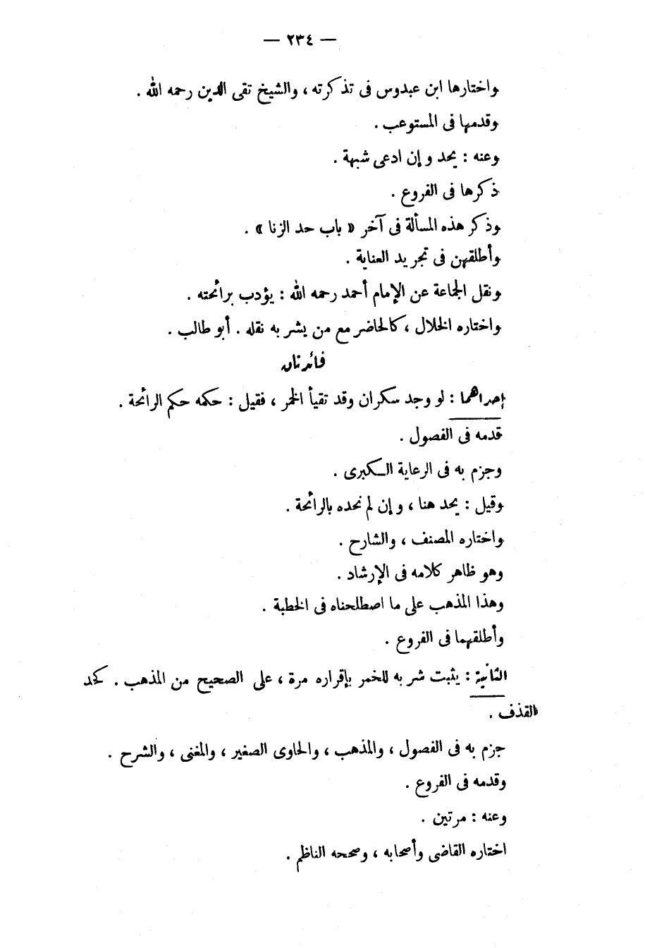 الثَّانِيَةُ: يَثْبُتُ شُرْبُهُ لِلْخَمْرِ بِإِقْرَارِهِ مَرَّةً، عَلَى الصَّحِيحِ مِنْ الْمَذْهَبِ. كَحَدِّ الْقَذْفِ، جَزَمَ بِهِ فِي الْفُصُولِ، وَالْمُذْهَبِ، وَالْحَاوِي الصَّغِيرِ، وَالْمُغْنِي، وَالشَّرْحِ، وَقَدَّمَهُ فِي الْفُرُوعِ. وَعَنْهُ: مَرَّتَيْنِ، اخْتَارَهُ الْقَاضِي وَأَصْحَابُهُ، وَصَحَّحَهُ النَّاظِمُ.