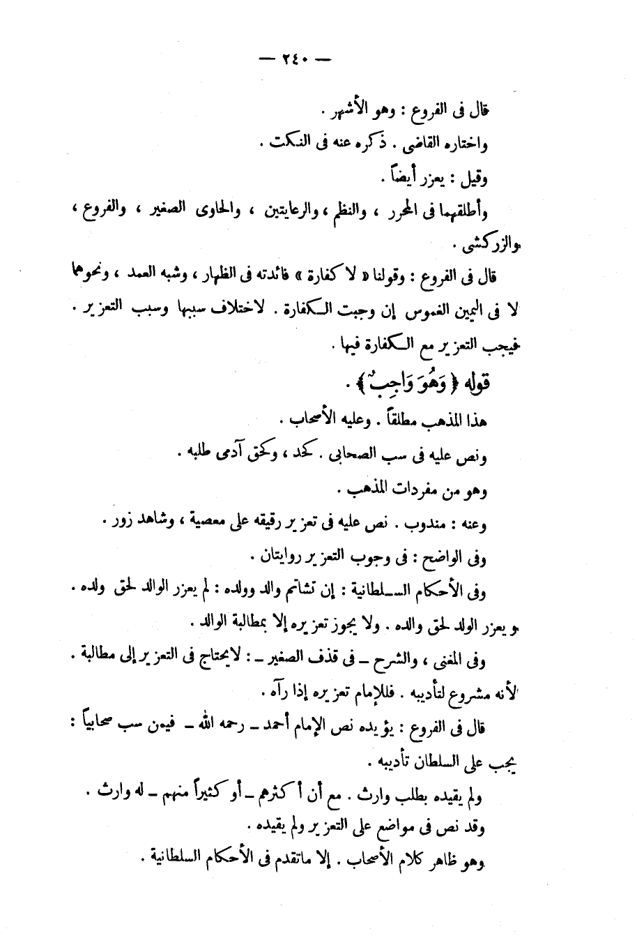 قَوْلُهُ (وَهُوَ وَاجِبٌ) . هَذَا الْمَذْهَبُ مُطْلَقًا. وَعَلَيْهِ الْأَصْحَابُ، وَنَصَّ عَلَيْهِ فِي سَبِّ الصَّحَابِيِّ. كَحَدٍّ، وَكَحَقِّ آدَمِيٍّ طَلَبَهُ. وَهُوَ مِنْ مُفْرَدَاتِ الْمَذْهَبِ. وَعَنْهُ: مَنْدُوبٌ، نَصَّ عَلَيْهِ فِي تَعْزِيرِ رَقِيقِهِ عَلَى مَعْصِيَةٍ، وَشَاهِدِ زُورٍ. وَفِي الْوَاضِحِ: فِي وُجُوبِ التَّعْزِيرِ رِوَايَتَانِ. وَفِي الْأَحْكَامِ السُّلْطَانِيَّةِ: إنْ تَشَاتَمَ وَالِدٌ وَوَلَدُهُ: لَمْ يُعَزَّرْ الْوَالِدُ لِحَقِّ وَلَدِهِ. وَيُعَزَّرُ الْوَلَدُ لِحَقِّ وَالِدِهِ. وَلَا يَجُوزُ تَعْزِيرُهُ إلَّا بِمُطَالَبَةِ الْوَالِدِ. وَفِي الْمُغْنِي، وَالشَّرْحِ فِي قَذْفِ الصَّغِيرِ: لَا يُحْتَاجُ فِي التَّعْزِيرِ إلَى مُطَالَبَةٍ؛ لِأَنَّهُ مَشْرُوعٌ لِتَأْدِيبِهِ. فَلِلْإِمَامِ تَعْزِيرُهُ إذَا رَآهُ. قَالَ فِي الْفُرُوعِ: يُؤَيِّدُهُ نَصُّ الْإِمَامِ أَحْمَدَ - رَحِمَهُ اللَّهُ - فِيمَنْ سَبَّ صَحَابِيًّا: يَجِبُ عَلَى السُّلْطَانِ تَأْدِيبُهُ. وَلَمْ يُقَيِّدْهُ بِطَلَبِ وَارِثٍ. مَعَ أَنَّ أَكْثَرَهُمْ أَوْ كَثِيرًا مِنْهُمْ لَهُ وَارِثٌ. وَقَدْ نَصَّ فِي مَوَاضِعَ عَلَى التَّعْزِيرِ وَلَمْ يُقَيِّدْهُ. وَهُوَ ظَاهِرُ كَلَامِ الْأَصْحَابِ. إلَّا مَا تَقَدَّمَ فِي الْأَحْكَامِ السُّلْطَانِيَّةِ.