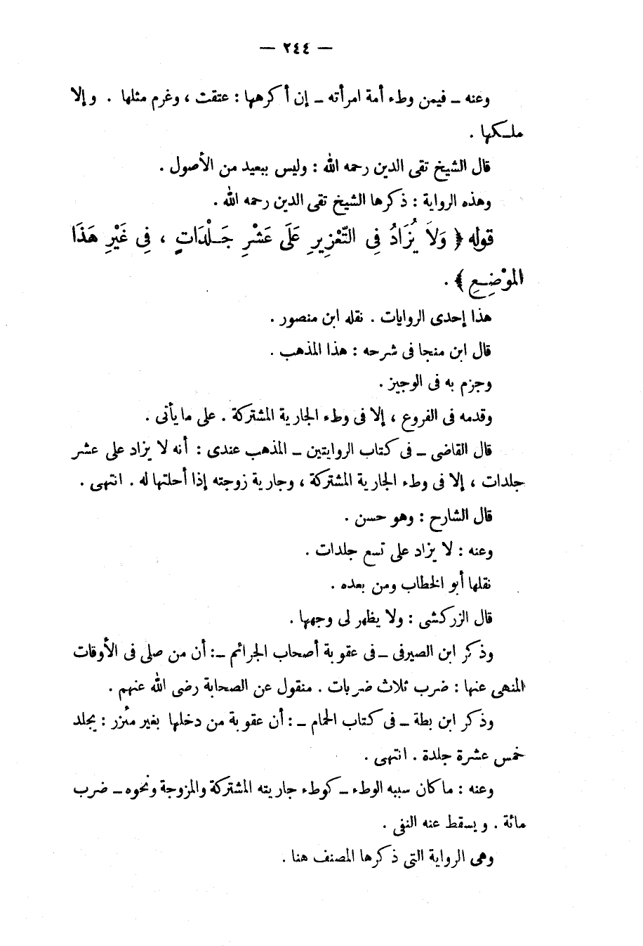 قَالَ الشَّارِحُ: وَهُوَ حَسَنٌ. وَعَنْهُ: لَا يُزَادُ عَلَى تِسْعِ جَلْدَاتٍ. نَقَلَهَا أَبُو الْخَطَّابِ وَمَنْ بَعْدَهُ. قَالَ الزَّرْكَشِيُّ: وَلَا يَظْهَرُ لِي وَجْهُهَا. وَذَكَرَ ابْنُ الصَّيْرَفِيِّ فِي عُقُوبَةِ أَصْحَابِ الْجَرَائِمِ: أَنَّ مَنْ صَلَّى فِي الْأَوْقَاتِ الْمَنْهِيِّ عَنْهَا: ضُرِبَ ثَلَاثَ ضَرَبَاتٍ. مَنْقُولٌ عَنْ الصَّحَابَةِ - رَضِيَ اللَّهُ عَنْهُمْ -. وَذَكَرَ ابْنُ بَطَّةَ فِي كِتَابِ الْحَمَّامِ: أَنَّ عُقُوبَةَ مَنْ دَخَلَهَا بِغَيْرِ مِئْزَرٍ: يُجْلَدُ خَمْسَ عَشْرَةَ جَلْدَةً. انْتَهَى.