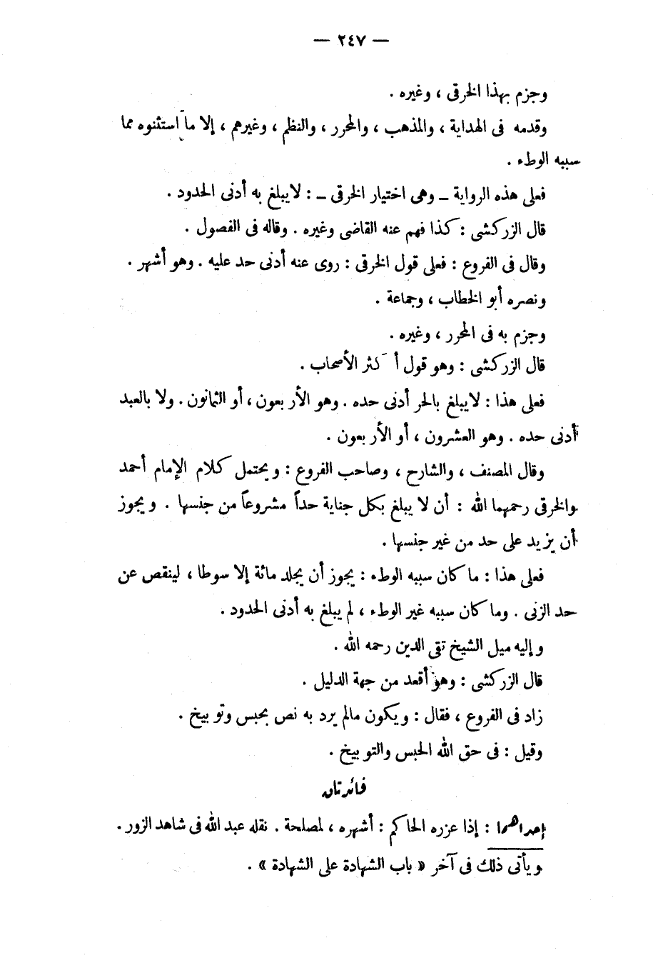 وَجَزَمَ بِهَذَا الْخِرَقِيُّ، وَغَيْرُهُ، وَقَدَّمَهُ فِي الْهِدَايَةِ، وَالْمُذْهَبِ، وَالْمُحَرَّرِ، وَالنَّظْمِ، وَغَيْرِهِمْ، إلَّا مَا اسْتَثْنَوْهُ مِمَّا سَبَبُهُ الْوَطْءُ. فَعَلَى هَذِهِ الرِّوَايَةِ وَهِيَ اخْتِيَارُ الْخِرَقِيِّ: لَا يَبْلُغُ بِهِ أَدْنَى الْحُدُودِ. قَالَ الزَّرْكَشِيُّ: كَذَا فَهِمَ عَنْهُ الْقَاضِي وَغَيْرُهُ. وَقَالَهُ فِي الْفُصُولِ. وَقَالَ فِي الْفُرُوعِ: فَعَلَى قَوْلِ الْخِرَقِيِّ: رُوِيَ عَنْهُ أَدْنَى حَدٍّ عَلَيْهِ. وَهُوَ أَشْهَرُ. وَنَصَرَهُ أَبُو الْخَطَّابِ، وَجَمَاعَةٌ، وَجَزَمَ بِهِ فِي الْمُحَرَّرِ، وَغَيْرِهِ. قَالَ الزَّرْكَشِيُّ: وَهُوَ قَوْلُ أَكْثَرِ الْأَصْحَابِ. فَعَلَى هَذَا: لَا يَبْلُغُ بِالْحُرِّ أَدْنَى حَدِّهِ. وَهُوَ الْأَرْبَعُونَ، أَوْ الثَّمَانُونَ. وَلَا بِالْعَبْدِ أَدْنَى حَدِّهِ. وَهُوَ الْعِشْرُونَ، أَوْ الْأَرْبَعُونَ. وَقَالَ الْمُصَنِّفُ، وَالشَّارِحُ، وَصَاحِبُ الْفُرُوعِ: وَيَحْتَمِلُ كَلَامُ الْإِمَامِ أَحْمَدَ وَالْخِرَقِيِّ رَحِمَهُمَا اللَّهُ: أَنْ لَا يَبْلُغَ جِنَايَةً حَدًّا مَشْرُوعًا مِنْ جِنْسِهَا. وَيَجُوزُ أَنْ يَزِيدَ عَلَى حَدٍّ مِنْ غَيْرِ جِنْسِهَا. فَعَلَى هَذَا: مَا كَانَ سَبَبُهُ الْوَطْءَ: يَجُوزُ أَنْ يُجْلَدَ مِائَةً إلَّا سَوْطًا، لِيَنْقُصَ عَنْ حَدِّ الزِّنَا. وَمَا كَانَ سَبَبُهُ غَيْرَ الْوَطْءِ، لَمْ يَبْلُغْ بِهِ أَدْنَى الْحُدُودِ. وَإِلَيْهِ مَيْلُ الشَّيْخِ تَقِيِّ الدِّينِ - رَحِمَهُ اللَّهُ -. قَالَ الزَّرْكَشِيُّ: وَهُوَ أَقْعَدُ مِنْ جِهَةِ الدَّلِيلِ. زَادَ فِي الْفُرُوعِ، فَقَالَ: وَيَكُونُ مَا لَمْ يَرِدْ بِهِ نَصٌّ بِحَبْسٍ وَتَوْبِيخٍ. وَقِيلَ: فِي حَقِّ اللَّهِ الْحَبْسُ وَالتَّوْبِيخُ.