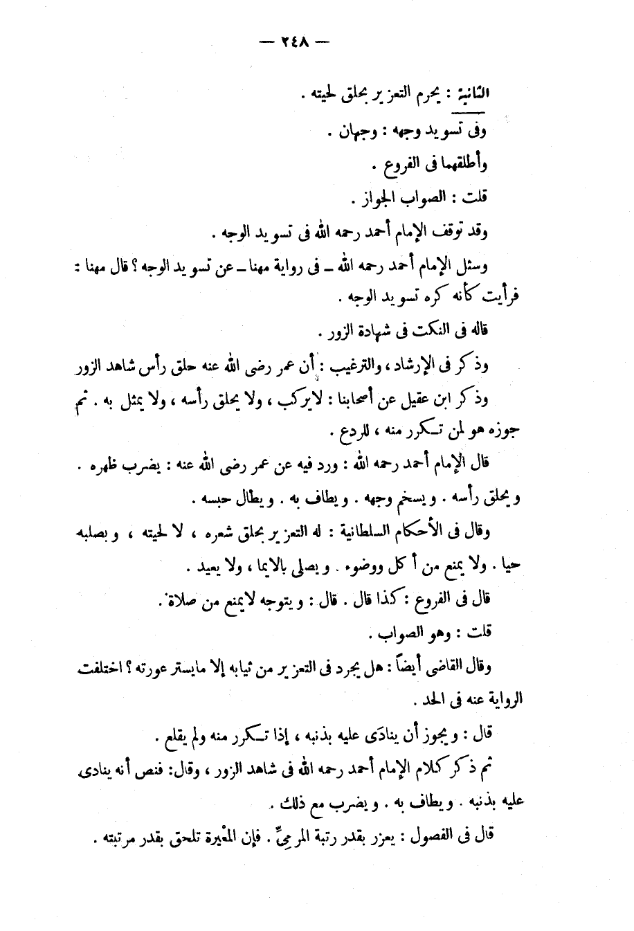 الثَّانِيَةُ: يَحْرُمُ التَّعْزِيرُ بِحَلْقِ لِحْيَتِهِ. وَفِي تَسْوِيدِ وَجْهِهِ: وَجْهَانِ. وَأَطْلَقَهُمَا فِي الْفُرُوعِ. قُلْت: الصَّوَابُ الْجَوَازُ. وَقَدْ تَوَقَّفَ الْإِمَامُ أَحْمَدُ - رَحِمَهُ اللَّهُ - فِي تَسْوِيدِ الْوَجْهِ. وَسُئِلَ الْإِمَامُ أَحْمَدُ - رَحِمَهُ اللَّهُ - فِي رِوَايَةِ مُهَنَّا عَنْ تَسْوِيدِ الْوَجْهِ؟ قَالَ مُهَنَّا: فَرَأَيْت كَأَنَّهُ كَرِهَ تَسْوِيدَ الْوَجْهِ. قَالَهُ فِي النُّكَتِ فِي شَهَادَةِ الزُّورِ. وَذَكَرَ فِي الْإِرْشَادِ، وَالتَّرْغِيبِ: أَنَّ عُمَرَ - رَضِيَ اللَّهُ عَنْهُ - حَلَقَ رَأْسَ شَاهِدِ الزُّورِ وَذَكَرَ ابْنُ عَقِيلٍ عَنْ أَصْحَابِنَا: لَا يَرْكَبُ، وَلَا يَحْلِقُ رَأْسَهُ، وَلَا يُمَثِّلُ بِهِ. ثُمَّ جَوَّزَهُ هُوَ لِمَنْ تَكَرَّرَ مِنْهُ، لِلرَّدْعِ. قَالَ الْإِمَامُ أَحْمَدُ - رَحِمَهُ اللَّهُ -: وَرَدَ فِيهِ عَنْ عُمَرَ - رَضِيَ اللَّهُ عَنْهُ -: يُضْرَبُ ظَهْرُهُ وَيُحْلَقُ رَأْسُهُ. وَيُسَخَّمُ وَجْهُهُ. وَيُطَافُ بِهِ. وَيُطَالُ حَبْسُهُ. وَقَالَ فِي الْأَحْكَامِ السُّلْطَانِيَّةِ: لَهُ التَّعْزِيرُ بِحَلْقِ شَعْرِهِ، لَا لِحْيَتِهِ، وَبِصَلْبِهِ حَيًّا. وَلَا يُمْنَعُ مِنْ أَكْلٍ وَوُضُوءٍ. وَيُصَلِّي بِالْإِيمَاءِ، وَلَا يُعِيدُ. قَالَ فِي الْفُرُوعِ: كَذَا قَالَ. قَالَ: وَيُتَوَجَّهُ لَا يُمْنَعُ مِنْ صَلَاةٍ. قُلْت: وَهُوَ الصَّوَابُ.